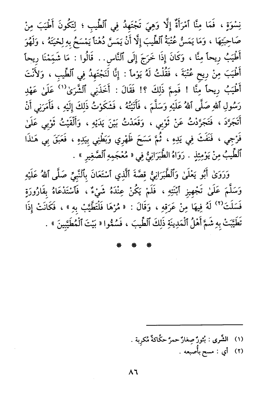 نسوة، فما منّا امرأة إلّا وهي تجتهد في الطّيب؛ لتكون أطيب من صاحبتها، وما يمسّ عتبة الطّيب إلّا أن يمسّ دهنا يمسح به لحيته، ولهو أطيب ريحا منّا، وكان إذا خرج إلى النّاس.. قالوا: ما شممنا ريحا أطيب من ريح عتبة، فقلت له يوما: إنّا لنجتهد في الطّيب، ولأنت أطيب ريحا منّا! فممّ ذلك؟! فقال: أخذني الشّرى «1» على عهد رسول الله صلّى الله عليه وسلّم، فأتيته، فشكوت ذلك إليه، فأمرني أن أتجرّد، فتجرّدت عن ثوبي، وقعدت بين يديه، وألقيت ثوبي على فرجي، فنفث في يده، ثمّ مسح ظهري وبطني بيده، فعبق بي هذا الطّيب من يومئذ. رواه الطّبرانيّ في «معجمه الصّغير» .