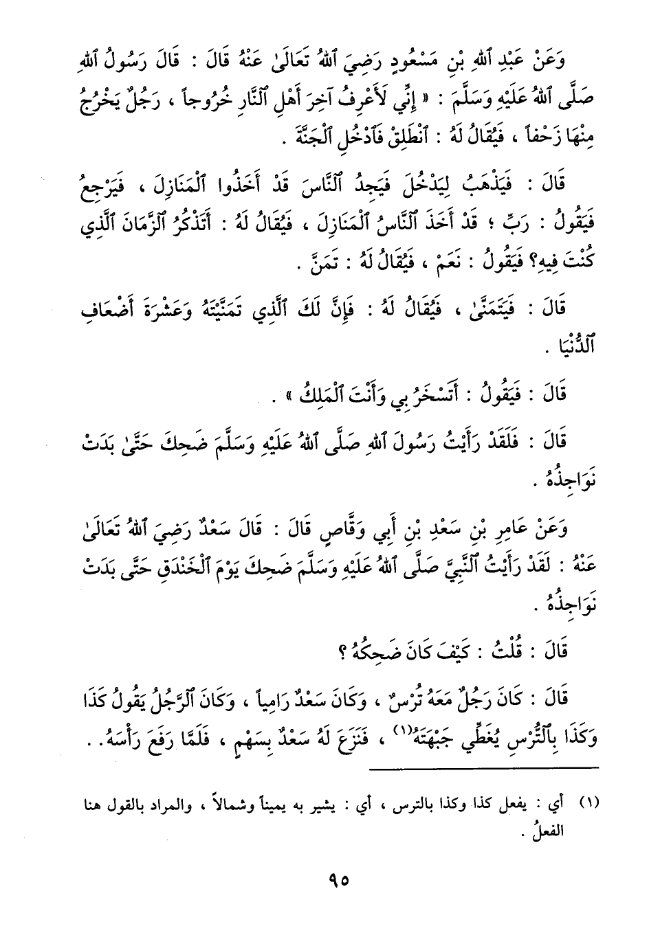 وعن عبد الله بن مسعود رضي الله تعالى عنه قال: قال رسول الله صلّى الله عليه وسلّم: «إنّي لأعرف اخر أهل النّار خروجا، رجل يخرج منها زحفا، فيقال له: انطلق فادخل الجنّة.