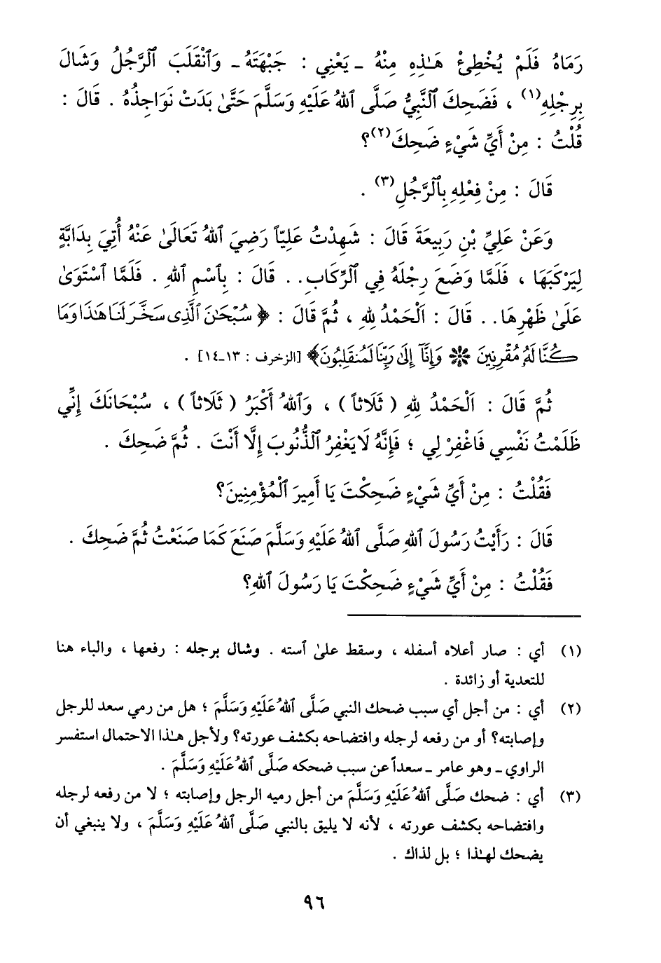 (3) أي: ضحك صلّى الله عليه وسلّم من أجل رميه الرجل وإصابته؛ لا من رفعه لرجله وافتضاحه بكشف عورته، لأنه لا يليق بالنبي صلّى الله عليه وسلّم، ولا ينبغي أن يضحك لهذا؛ بل لذاك.