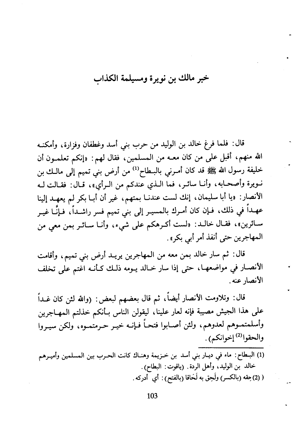 قَالَ: فَلَمَّا فَرَغَ خَالِدُ بْنُ الْوَلِيدِ مِنْ حَرْبِ بَنِي أَسَدٍ وَغَطَفَانَ وَفَزَارَةَ، وَأَمْكَنَهُ اللَّهُ مِنْهُمْ، أَقْبَلَ عَلَى مَنْ كَانَ مَعَهُ مِنَ الْمُسْلِمِينَ، فَقَالَ لَهُمْ: «إِنَّكُمْ تَعْلَمُونَ أَنَّ خَلِيفَةَ رَسُولِ الله صلّى الله عليه وآله وَسَلَّمَ قَدْ كَانَ أَمَرَنِي بِالْبِطَاحِ [1] مِنْ أَرْضِ بَنِي تَمِيمٍ إِلَى مَالِكِ بْنِ نُوَيْرَةَ وَأَصْحَابِهِ، وَأَنَا سَائِرٌ، فَمَا الَّذِي عِنْدَكُمْ مِنَ الرَّأْيِ» ، قَالَ: فَقَالَتْ لَهُ الأَنْصَارُ: «يَا أَبَا سُلَيْمَانَ، إِنَّكَ لَسْتَ عِنْدَنَا بِمُتَّهَمٍ، غَيْرَ أَنَّ أَبَا بَكْرٍ لَمْ يَعْهَدْ إِلَيْنَا عَهْدًا فِي ذَلِكَ، فَإِنْ كَانَ أَمَرَكَ بِالْمَسِيرِ إِلَى بَنِي تَمِيمٍ فَسِرْ رَاشِدًا، فَإِنَّاَ غَيْرُ سَائِرِينَ» ، فَقَالَ خَالِدٌ: «لَسْتُ أُكْرِهُكُمْ عَلَى شَيْءٍ، وَأَنَا سَائِرٌ بِمَنْ مَعِي مِنَ الْمُهَاجِرِينَ حَتَّى أُنْفِذَ أَمْرَ أَبِي بَكْرٍ» .