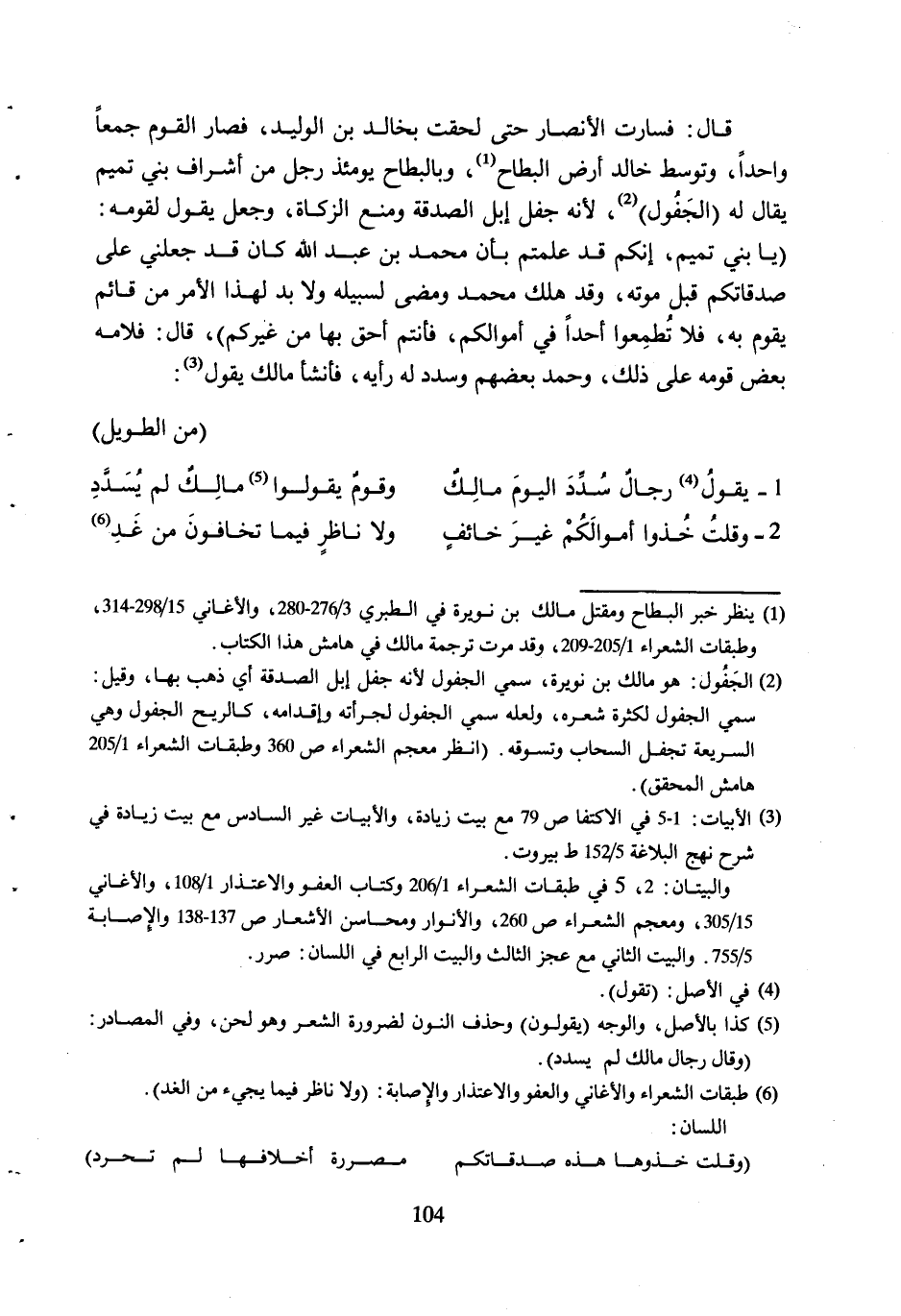 [1] ينظر خبر البطاح ومقتل مالك بن نويرة في الطبري 3/ 276- 280، والأغاني 15/ 298- 314، وطبقات الشعراء 1/ 205- 209، وقد مرت ترجمة مالك في هامش هذا الكتاب.
