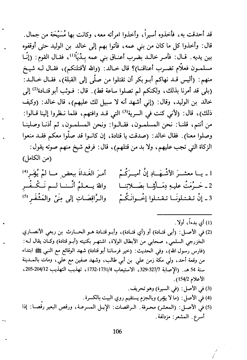مَنْ أَنْتُمْ، قُلْنَا: نَحْنُ الْمُسْلِمُونَ، فَقَالُوا: وَنَحْنُ الْمُسْلِمُونَ، ثُمَّ أَذَنَّا وَصَلَّيْنَا وَصَلَّوْا مَعَنَا) . فَقَالَ خَالِدٌ: (صَدَقْتَ يَا قَتَادَةُ، إِنْ كَانُوا قَدْ صَلَّوْا مَعَكُمْ فَقَدْ مَنَعُوا الزَّكَاةَ الَّتِي تَجِبُ عَلَيْهِمْ، وَلا بُدَّ مِنْ قَتْلِهِمْ) ، قَالَ: فَرَفَعَ شَيْخٌ مِنْهُمْ صَوْتَهُ يَقُولُ: