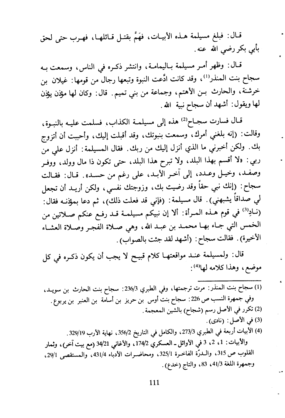 [1] سجاح بنت المنذر: مرت ترجمتها، وفي الطبري 3/ 236: سجاح بنت الحارث بن سويد، وفي جمهرة النسب ص 226: سجاح بنت أوس بن حريز بن أسامة بن العنبر بن يربوع.