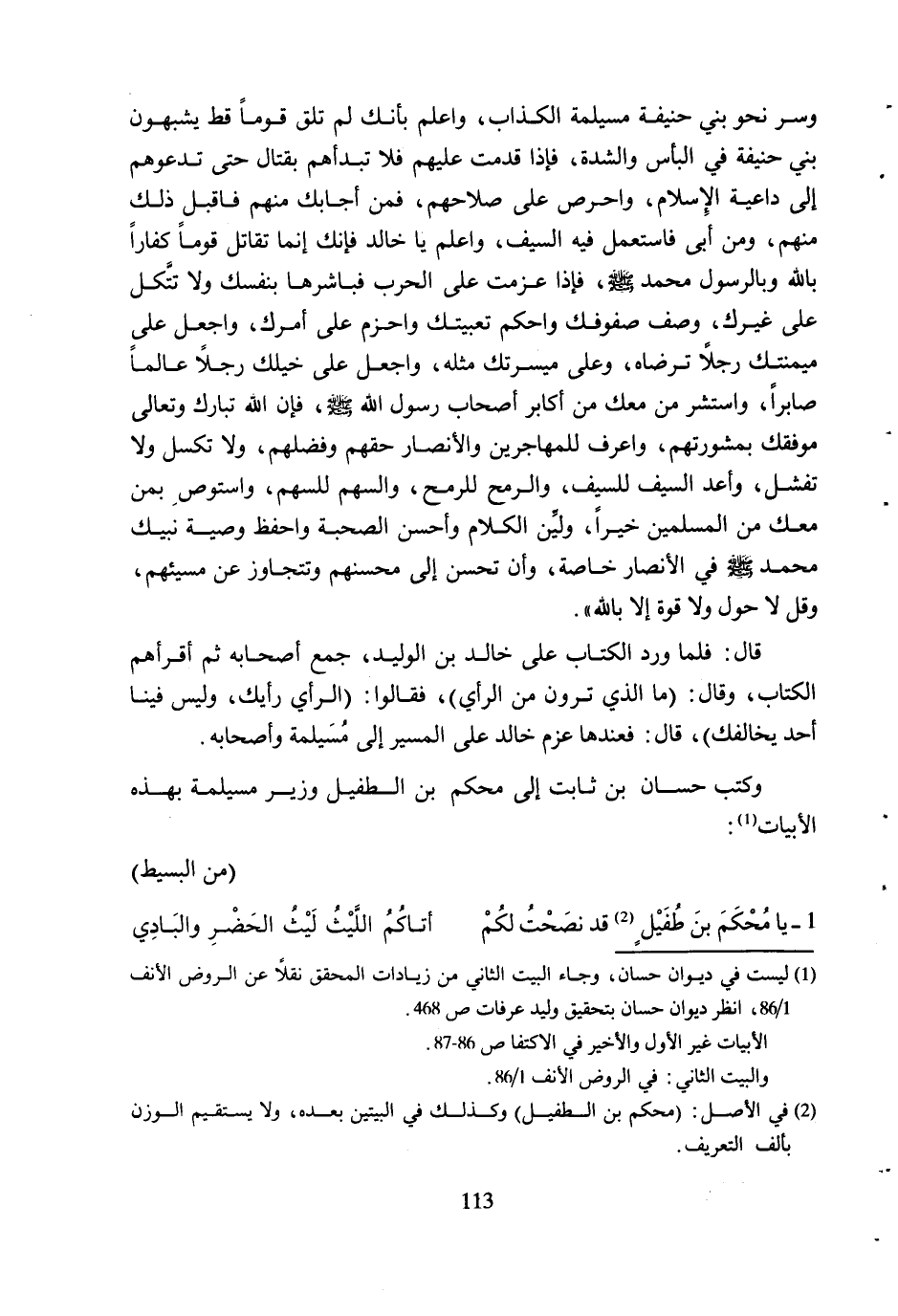 وَكَتَبَ حَسَّانُ بْنُ ثَابِتٍ إِلَى مُحْكَمِ بْنِ الطُّفَيْلِ وَزِيرِ مُسَيْلِمَةَ بِهَذِهِ الأَبْيَاتِ [1] :