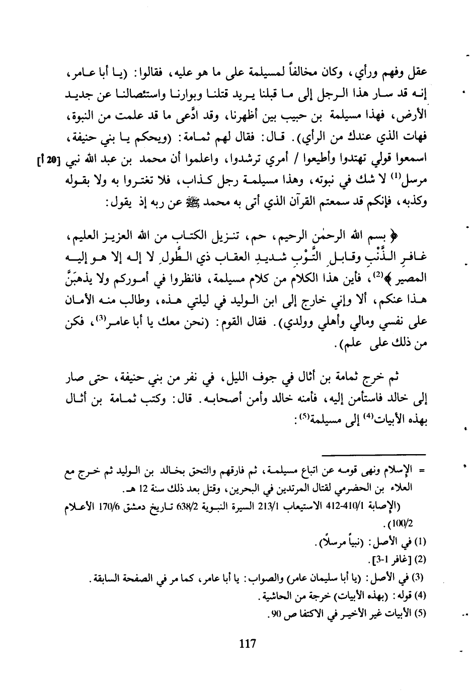 بِسْمِ اللَّهِ الرَّحْمنِ الرَّحِيمِ، حم، تَنْزِيلُ الْكِتابِ مِنَ اللَّهِ الْعَزِيزِ الْعَلِيمِ، غافِرِ الذَّنْبِ وَقابِلِ التَّوْبِ شَدِيدِ الْعِقابِ ذِي الطَّوْلِ لا إِلهَ إِلَّا هُوَ إِلَيْهِ الْمَصِيرُ 40: 0- 3 [2] ، فَأَيْنَ هَذَا الْكَلامُ مِنْ كَلامِ مُسَيْلِمَةَ، فَانْظُرُوا فِي أُمُورِكُمْ وَلا يَذْهَبَنَّ هَذَا عَنْكُمْ، أَلا وَإِنِّي خَارِجٌ إِلَى ابْنِ الْوَلِيدِ فِي لَيْلَتِي هَذِهِ، وَطَالِبٌ مِنْهُ الأَمَانَ عَلَى نَفْسِي وَمَالِي وَأَهْلِي وَوَلَدِي) . فَقَالَ الْقَوْمُ: (نَحْنُ مَعَكَ يَا أَبَا عَامِرٍ [3] ، فَكُنْ مِنْ ذَلِكَ عَلَى عِلْمٍ) .