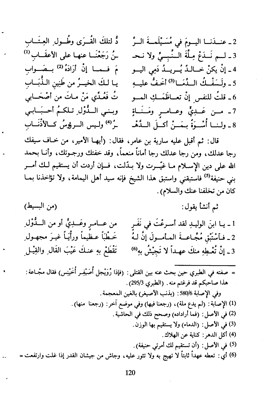 2- عِنْدَنَا الْيَوْمَ فِي مُسَيْلِمَةَ الرَّ ... دِّ لِتِلْكَ الْقُرَى وَطُولِ الْعِتَابِ