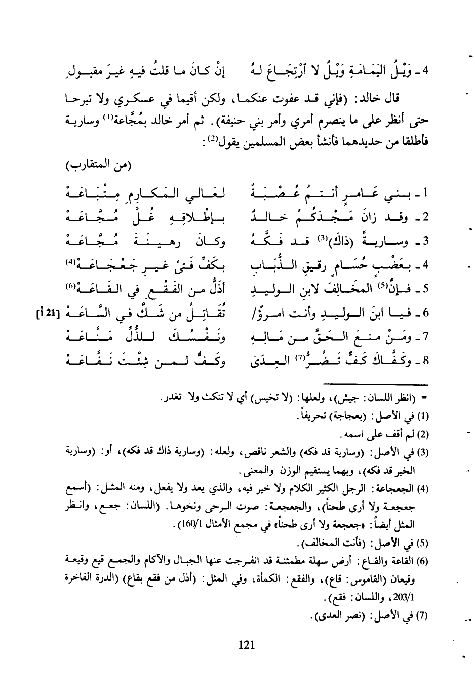 6- فيا ابن الْوَلِيدِ وَأَنْتَ امْرُؤٌ/ ... تُقَاتِلُ مَنْ شَكَّ فِي السّاعه [21 أ]