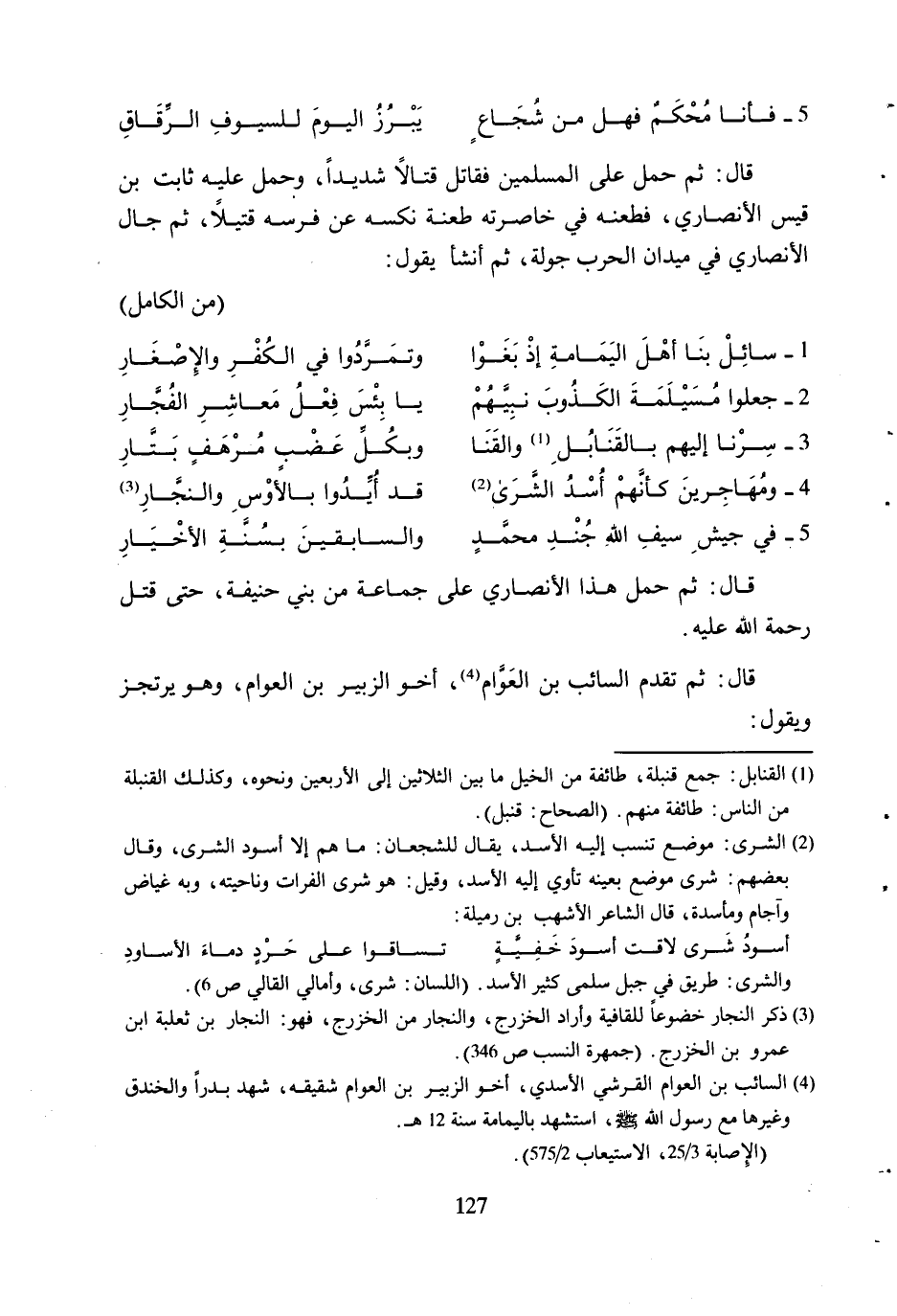قَالَ: ثُمَّ تَقَدَّمَ السَّائِبُ بْنُ الْعَوَّامِ [4] ، أَخُو الزُّبَيْرِ بْنِ الْعَوَّامِ، وهو يرتجز ويقول: