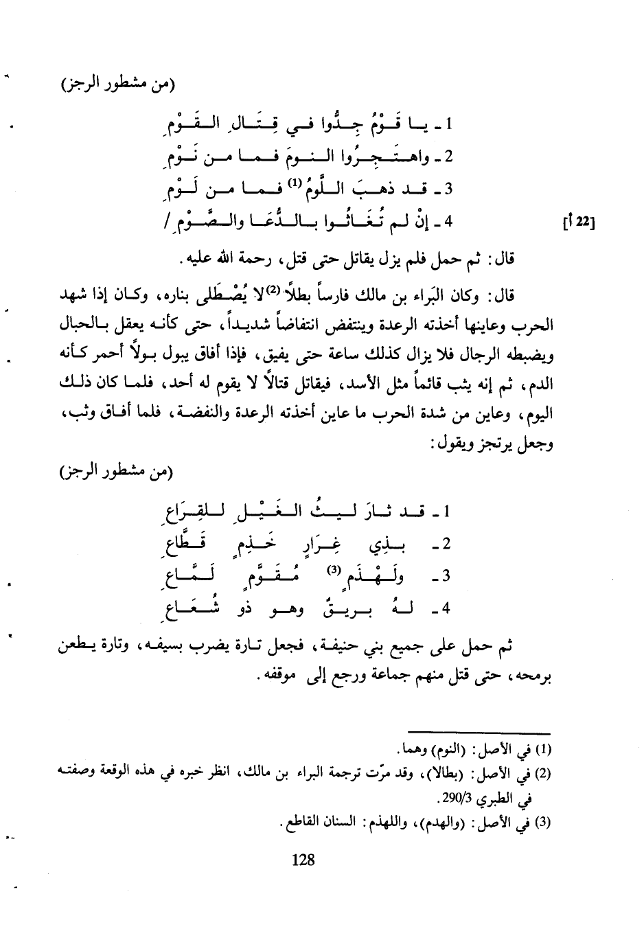 [2] في الأصل: (بطالا) ، وقد مرّت ترجمة البراء بن مالك، انظر خبره في هذه الوقعة وصفته في الطبري 3/ 290.