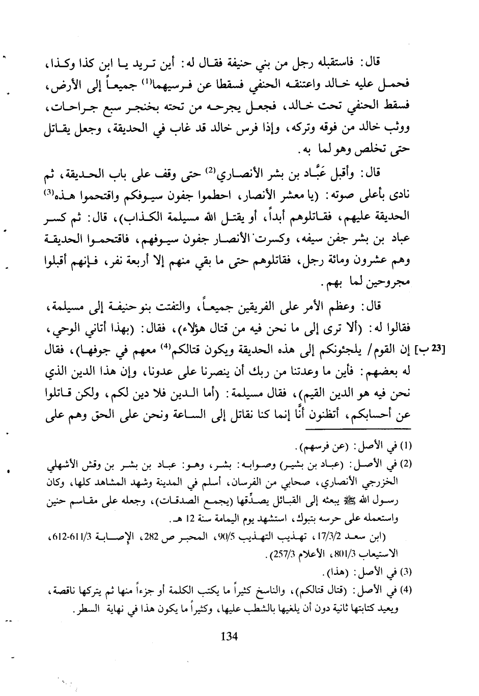 قَالَ: وَعَظُمَ الأَمْرُ عَلَى الْفَرِيقَيْنِ جَمِيعًا، وَالْتَفَتَتْ بَنُو حَنِيفَةَ إِلَى مُسَيْلِمَةَ، فَقَالُوا لَهُ: (أَلا تَرَى إِلَى مَا نَحْنُ فِيهِ مِنْ قِتَالِ هَؤُلاءِ) ، فَقَالَ: (بِهَذَا أتاني الوحي، [23 ب] إِنَّ الْقَوْمَ/ يُلْجِئُونَكُمْ إِلَى هَذِهِ الْحَدِيقَةِ وَيَكُونُ قِتَالُكُمْ [4] مَعَهُمْ فِي جَوْفِهَا) ، فَقَالَ لَهُ بَعْضُهُمْ: فَأَيْنَ مَا وَعَدْتَنَا مِنْ رَبِّكَ أَنْ يَنْصُرَنَا عَلَى عَدُوِّنَا، وَإِنَّ هَذَا الدِّينَ الَّذِي نَحْنُ فِيهِ هُوَ الدِّينُ الْقَيِّمُ) ، فَقَالَ مُسَيْلِمَةُ: (أَمَّا الدِّينُ فَلا دِينَ لَكُمْ، وَلَكِنْ قَاتِلُوا عَنْ أَحْسَابِكُمْ، أَتَظُنُّونَ أَنَّا إِنَّمَا كُنَّا نُقَاتِلُ إِلَى الساعة ونحن على الحق وهم على