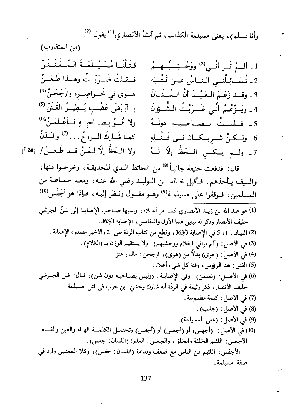 1- أَلَمْ تَرَ أَنِّي [3] وَوَحْشِيُّهُمْ ... قَتَلْنَا مُسَيْلِمَةَ الْمُفْتَتَنْ