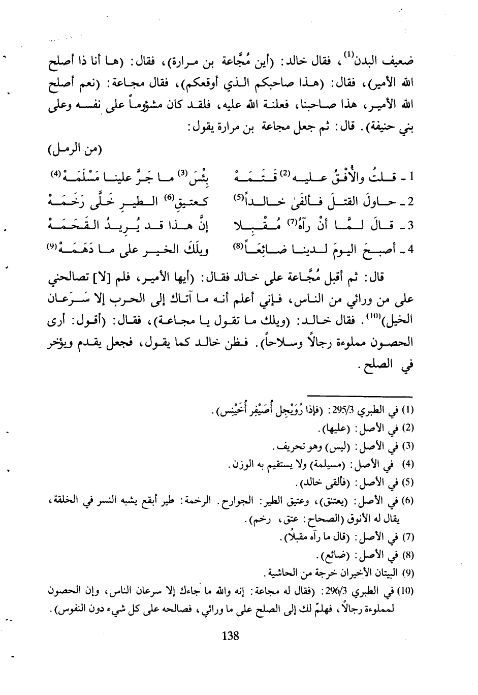 [10] في الطبري 3/ 296: (فقال له مجاعة: إنه والله ما جاءك إلا سرعان الناس، وإن الحصون لمملوءة رجالا، فهلمّ لك إلى الصلح على ما ورائي، فصالحه على كل شيء دون النفوس) .