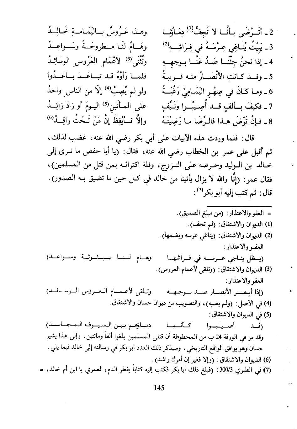 [7] في الطبري 3/ 300: (فبلغ ذلك أبا بكر فكتب إليه كتابا يقطر الدم، لعمري يا ابن أم خالد،