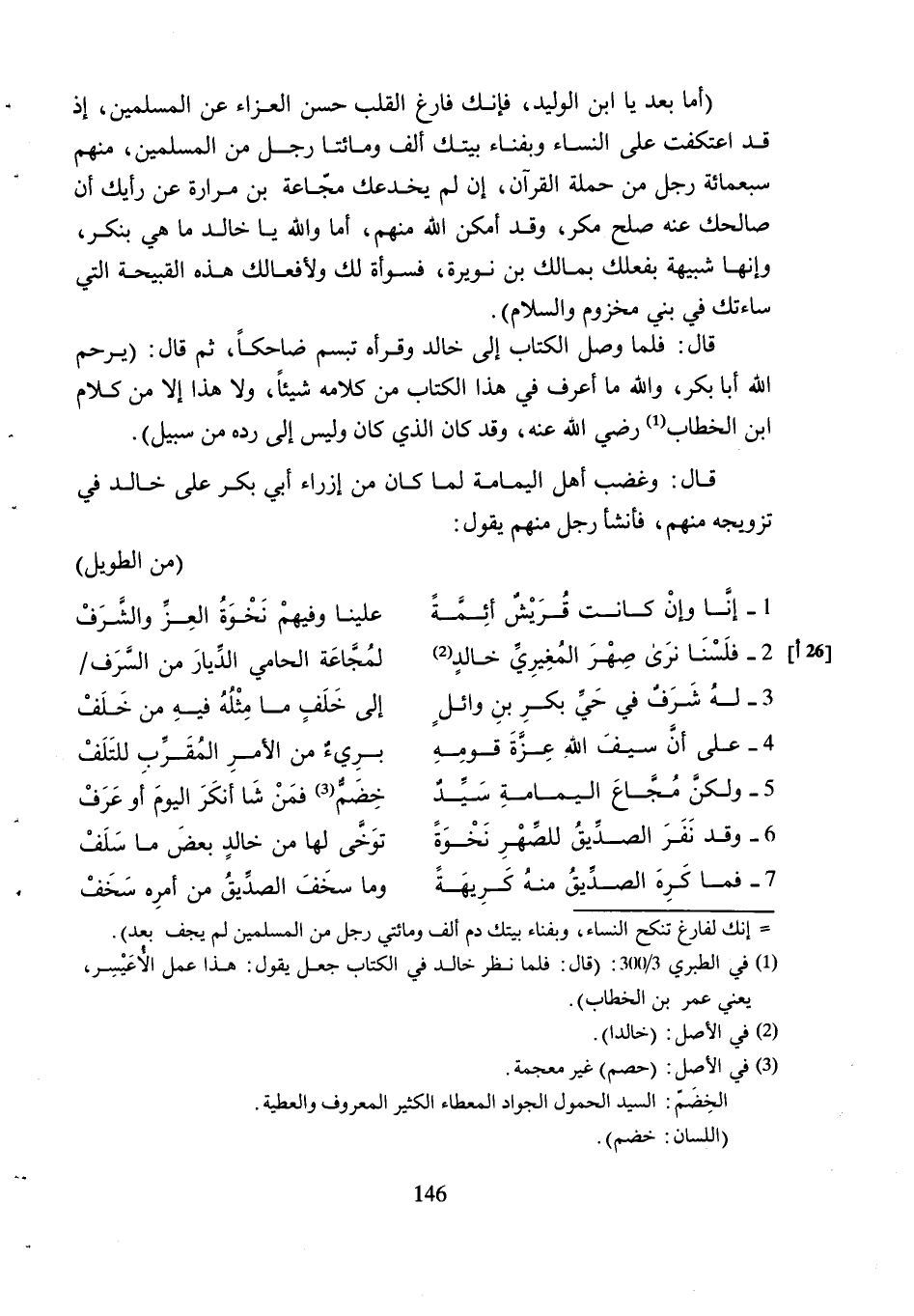 (أما بعد يا ابن الْوَلِيدِ، فَإِنَّكَ فَارِغُ الْقَلْبِ حَسَنُ الْعَزَاءِ عَنِ الْمُسْلِمِينَ، إِذْ قَدِ اعْتَكَفْتَ عَلَى النِّسَاءِ وَبِفِنَاءِ بَيْتِكَ أَلْفٌ وَمِائَتَا رَجُلٍ مِنَ الْمُسْلِمِينَ، مِنْهُمْ سبعمائة رَجُلٍ مِنْ حَمَلَةِ الْقُرْآنِ، إِنْ لَمْ يَخْدَعْكَ مُجَّاعَةُ بْنُ مُرَارَةَ عَنْ رَأْيِكَ أَنْ صَالَحَكَ عَنْهُ صُلْحَ مَكْرٍ، وَقَدْ أَمْكَنَ اللَّهُ مِنْهُمْ، أَمَا وَاللَّهِ يَا خَالِدُ مَا هِيَ بِنُكْرٍ، وَإِنَّهَا شَبِيهَةٌ بِفِعْلِكَ بِمَالِكِ بْنِ نُوَيْرَةَ، فَسَوْأَةٌ لَكَ وَلأَفْعَالِكَ هَذِهِ الْقَبِيحَةِ الَّتِي سَاءَتْكَ فِي بَنِي مَخْزُومٍ وَالسَّلامُ) .