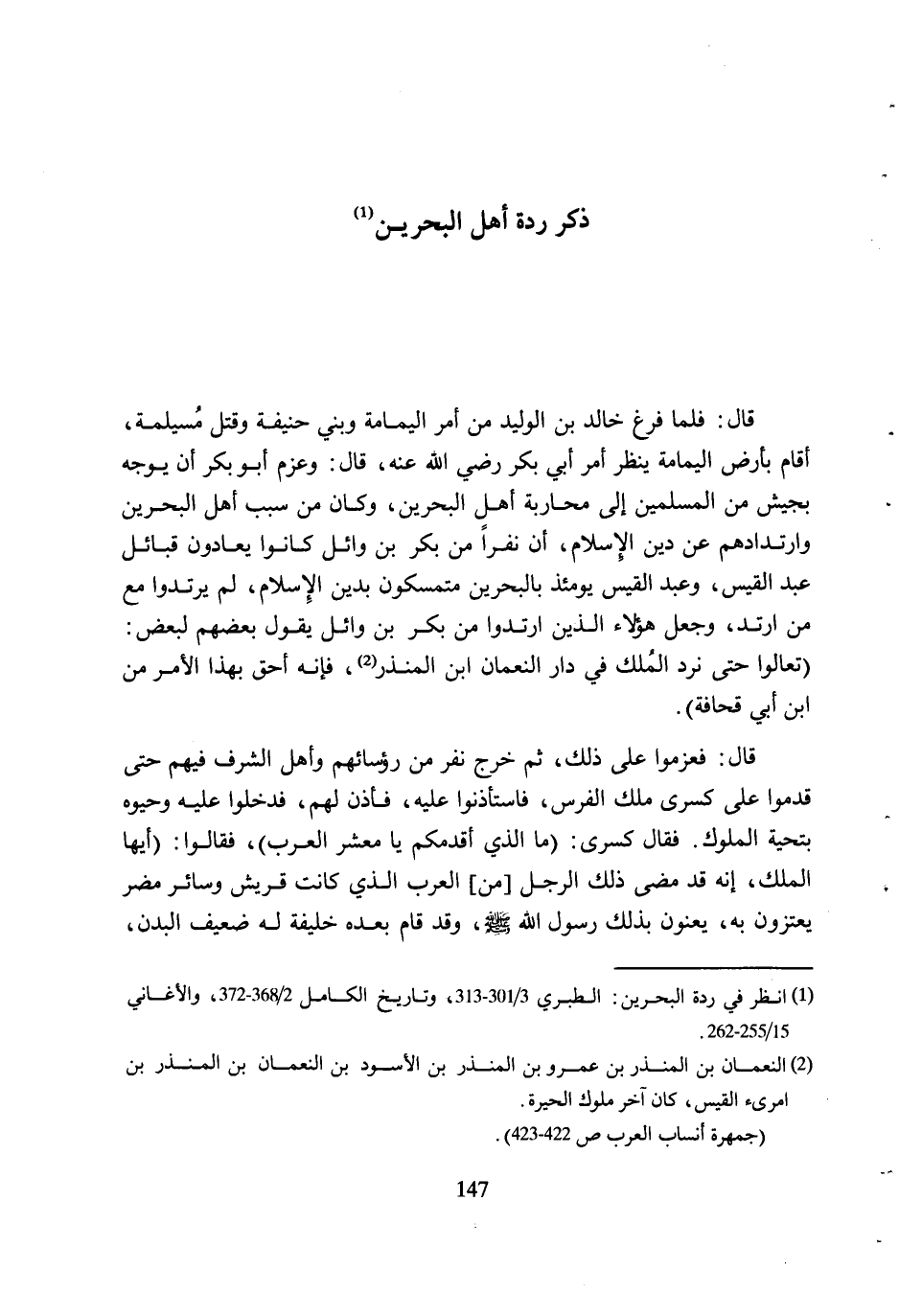 [1] انظر في ردة البحرين: الطبري 3/ 301- 313، وتاريخ الكامل 2/ 368- 372، والأغاني 15/ 255- 262.