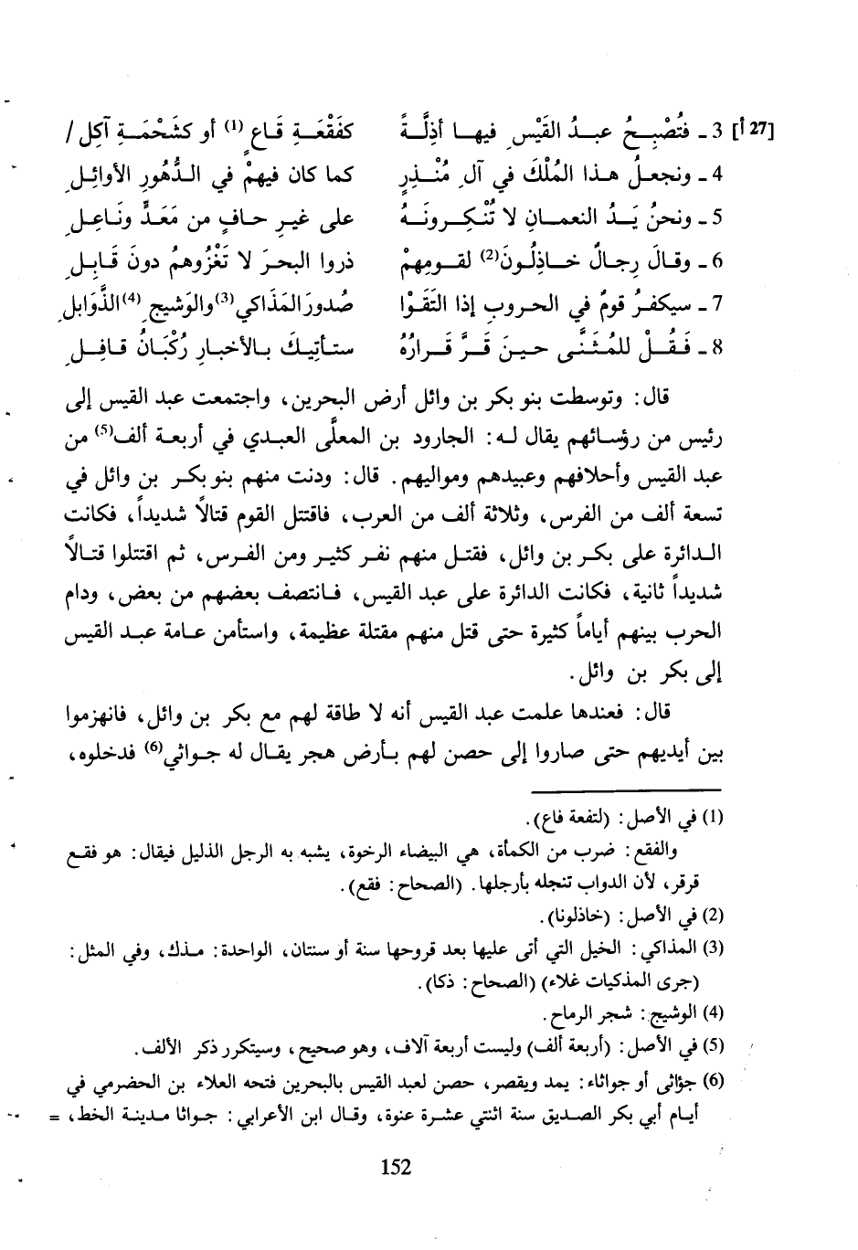 [27 أ] 3- فَتُصْبِحُ عَبْدُ الْقَيْسِ فِيهَا أَذِلَّةً ... كَفَقْعَةِ قَاعٍ [1] أَوْ كَشَحْمَةِ آكِلِ