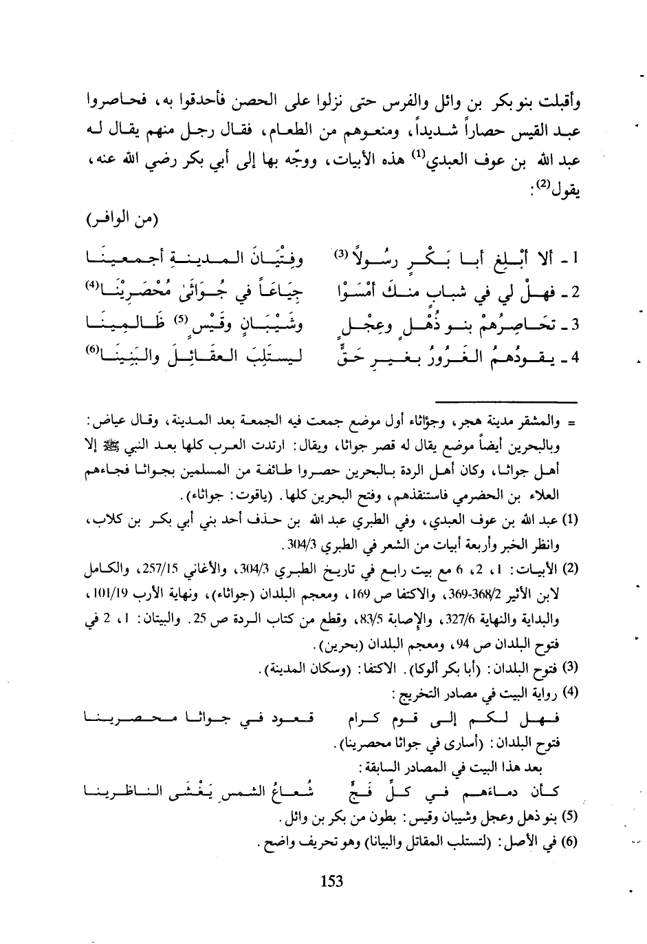 [2] الأبيات: 1، 2، 6 مع بيت رابع في تاريخ الطبري 3/ 304، والأغاني 15/ 257، والكامل لابن الأثير 2/ 368- 369، والاكتفاء ص 169، ومعجم البلدان (جواثاء) ، ونهاية الأرب 19/ 101، والبداية والنهاية 6/ 327، والإصابة 5/ 83، وقطع من كتاب الردة ص 25. والبيتان: 1، 2 في فتوح البلدان ص 94، ومعجم البلدان (بحرين) .