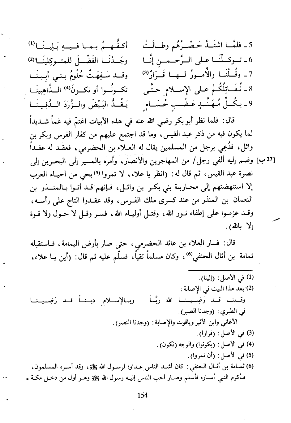 قَالَ: فَلَمَّا نَظَرَ أَبُو بَكْرٍ رَضِيَ اللَّهُ عَنْهُ فِي هَذِهِ الأَبْيَاتِ اغْتَمَّ فِيهِ غَمًّا شَدِيدًا لِمَا يَكُونُ فِيهِ مِنْ ذِكْرِ عَبْدِ الْقَيْسِ، وَمَا قَدِ اجْتَمَعَ عَلَيْهِمْ مِنْ كُفَّارِ الْفُرْسِ وَبَكْرِ بْنِ وَائِلٍ، فَدُعِيَ بِرَجُلٍ مِنَ الْمُسْلِمِينَ يُقَالُ لَهُ الْعَلاءُ بْنُ الْحَضْرَمِيِّ، فَعَقَدَ لَهُ عَقْدًا [27 ب] وَضَمَّ إِلَيْهِ أَلْفَيْ رَجُلٍ/ مِنَ الْمُهَاجِرِينَ وَالأَنْصَارِ، وَأَمَرَهُ بِالْمَسِيرِ إِلَى الْبَحْرَيْنِ إِلَى نُصْرَةِ عَبْدِ الْقَيْسِ، ثُمَّ قَالَ لَهُ: (انْظُرْ يَا عَلاءُ، لا تَمُرُّوا [5] بِحَيٍّ مِنْ أَحْيَاءِ الْعَرَبِ إِلا اسْتَنْهَضْتَهُمْ إِلَى مُحَارَبَةِ بَنِي بَكْرِ بْنِ وَائِلٍ، فَإِنَّهُمْ قَدْ أَتَوْا بِالْمُنْذِرِ بْنِ النُّعْمَانِ بْنِ الْمُنْذِرِ مِنْ عِنْدِ كِسْرَى مَلِكِ الْفُرْسِ، وَقَدْ عَقَدُوا التَّاجَ عَلَى رَأْسِهِ، وَقَدْ عَزَمُوا عَلَى إِطْفَاءِ نُورِ اللَّهِ، وَقَتْلِ أَوْلِيَاءِ اللَّهِ، فَسِرْ وَقُلْ لا حَوْلَ وَلا قُوَّةَ إِلا باللَّه) .