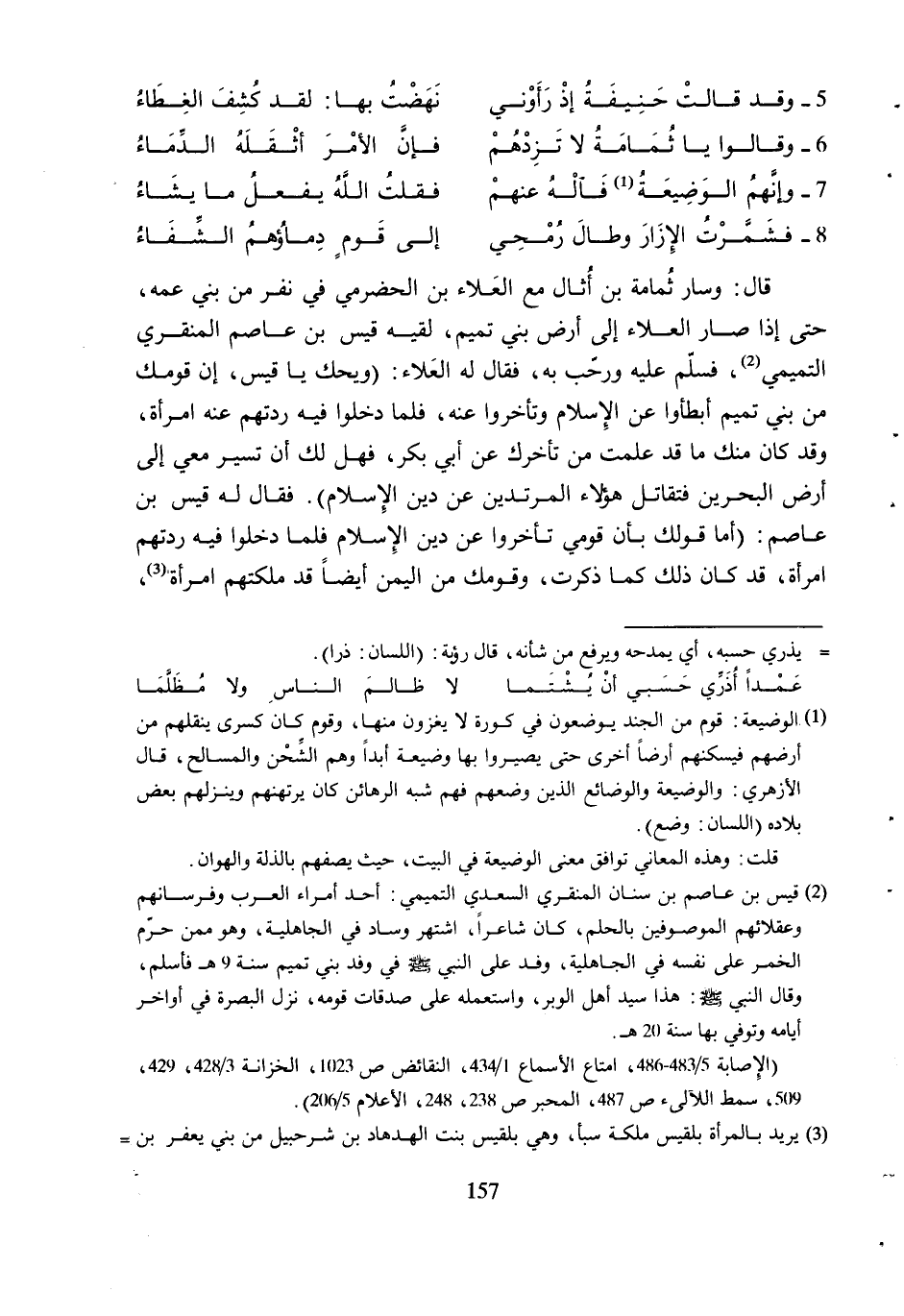قَالَ: وَسَارَ ثُمَامَةُ بْنُ أَثَالٍ مَعَ الْعَلاءِ بْنِ الْحَضْرَمِيِّ فِي نَفَرٍ مِنْ بَنِي عَمِّهِ، حَتَّى إِذَا صَارَ الْعَلاءُ إِلَى أَرْضِ بَنِي تَمِيمٍ، لَقِيَهُ قَيْسُ بْنُ عَاصِمٍ الْمِنْقَرِيُّ التَّمِيمِيُّ [2] ، فَسَلَّمَ عَلَيْهِ وَرَحَّبَ بِهِ، فَقَالَ لَهُ الْعَلاءُ: (وَيْحَكَ يَا قَيْسُ، إِنَّ قَوْمَكَ مِنْ بَنِي تَمِيمٍ أَبْطَأُوا عَنِ الإِسْلامِ وَتَأَخَّرُوا عَنْهُ، فَلَمَّا دَخَلُوا فِيهِ رَدَّتْهُمْ عَنْهُ امْرَأَةٌ، وَقَدْ كَانَ مِنْكَ مَا قَدْ عَلِمْتَ مِنْ تَأَخُّرِكَ عَنْ أَبِي بَكْرٍ، فَهَلْ لَكَ أَنْ تَسِيرَ مَعِي إِلَى أَرْضِ الْبَحْرَيْنِ فَتُقَاتِلُ هَؤُلاءِ الْمُرْتَدِّينَ عَنْ دِينِ الإِسْلامِ) . فَقَالَ لَهُ قَيْسُ بْنُ عَاصِمٍ: (أَمَّا قَوْلُكَ بِأَنَّ قَوْمِي تَأَخَّرُوا عَنْ دِينِ الإِسْلامِ فَلَمَّا دَخَلُوا فِيهِ رَدَّتْهُمُ امْرَأَةٌ، قَدْ كَانَ ذَلِكَ كَمَا ذَكَرْتَ، وَقَوْمُكَ مِنَ اليمن أيضا قد ملكتهم امرأة [3] ،