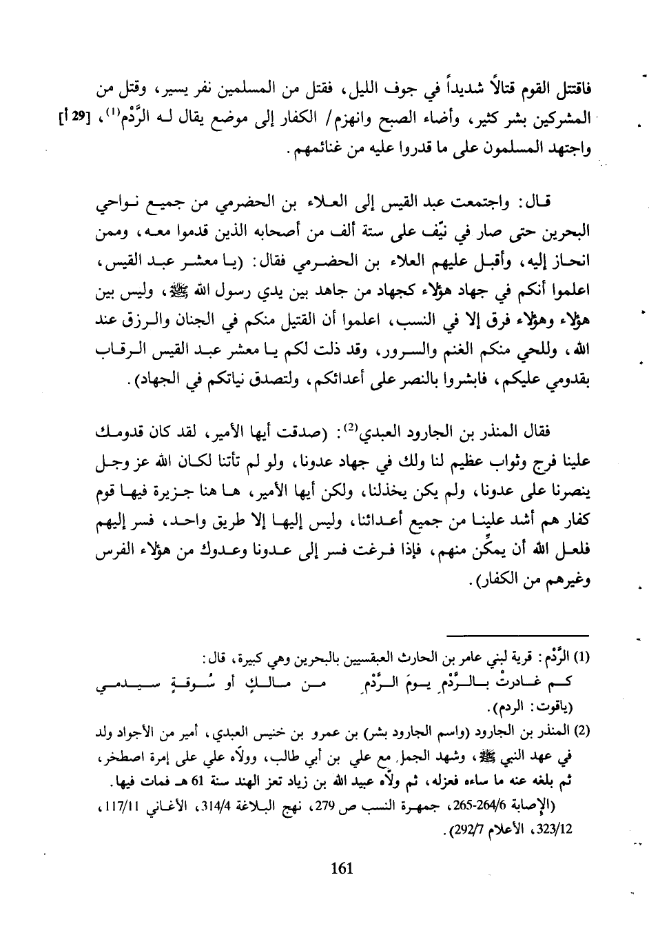 قَالَ: وَاجْتَمَعَتْ عَبْدُ الْقَيْسِ إِلَى الْعَلاءِ بْنِ الْحَضْرَمِيِّ مِنْ جَمِيعِ نَوَاحِي الْبَحْرَيْنِ حَتَّى صَارَ فِي نَيِّفٍ عَلَى سِتَّةِ أَلْفٍ مِنْ أَصْحَابِهِ الَّذِينَ قَدِمُوا مَعَهُ، وَمِمَّنِ انْحَازَ إِلَيْهِ، وَأَقْبَلَ عَلَيْهِمُ الْعَلاءُ بْنُ الْحَضْرَمِيِّ فَقَالَ: (يَا مَعْشَرَ عَبْدِ الْقَيْسِ، اعْلَمُوا أَنَّكُمْ فِي جِهَادِ هَؤُلاءِ كَجِهَادِ مَنْ جَاهَدَ بَيْنَ يَدَيْ رَسُولِ الله صلّى الله عليه وآله وَسَلَّمَ، وَلَيْسَ بَيْنَ هَؤُلاءِ وَهَؤُلاءِ فَرْقٌ إِلا فِي النَّسَبِ، اعْلَمُوا أَنَّ الْقَتِيلَ مِنْكُمْ فِي الْجِنَانِ وَالرِّزْقُ عِنْدَ اللَّهِ، وَلِلْحَيِّ مِنْكُمُ الْغُنْمُ وَالسُّرُورُ، وَقَدْ ذَلَّتْ لَكُمْ يَا مَعْشَرَ عَبْدِ الْقَيْسِ الرِّقَابُ بِقُدُومِي عَلَيْكُمْ، فَأَبْشِرُوا بِالنَّصْرِ عَلَى أَعْدَائِكُمْ، وَلْتَصْدُقْ نِيَّاتُكُمْ فِي الْجِهَادِ) .