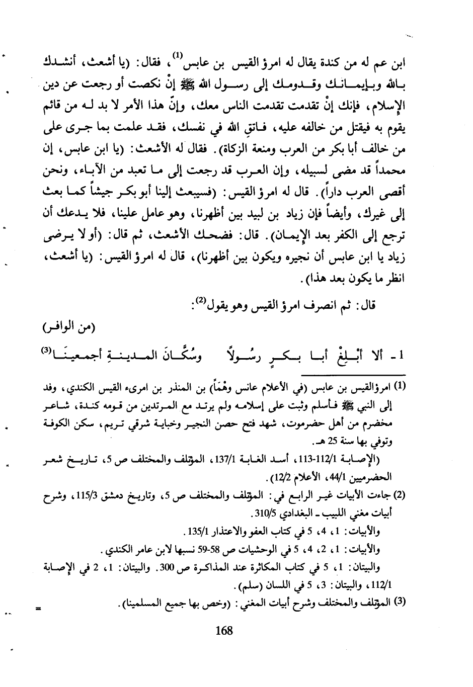 [1] امرؤ القيس بن عابس (في الأعلام عانس وهما) بن المنذر بن امرئ القيس الكندي، وفد إلى النبي صلّى الله عليه وآله وسلّم فأسلم وثبت على إسلامه ولم يرتد مع المرتدين من قومه كندة، شاعر مخضرم من أهل حضرموت، شهد فتح حصن النجير وخباية شرقي تريم، سكن الكوفة وتوفي بها سنة 25 هـ-.