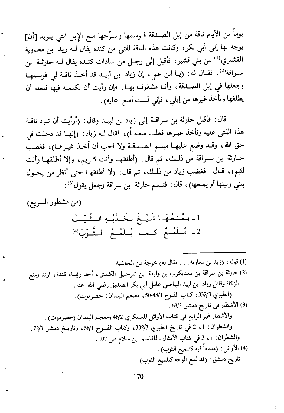 قَالَ: فَأَقْبَلَ حَارِثَةُ بْنُ سُرَاقَةَ إِلَى زِيَادِ بْنِ لَبِيدٍ وَقَالَ: (أَرَأَيْتَ أَنْ تَرُدَّ نَاقَةَ هَذَا الْفَتَى عَلَيْهِ وَتَأْخُذَ غَيْرَهَا فَعَلْتَ مُنَعَّمًا) ، فَقَالَ لَهُ زِيَادٌ: (إِنَّهَا قَدْ دَخَلَتْ فِي حَقِّ اللَّهِ، وَقَدْ وَضَعَ عَلَيْهَا مِيسَمَ الصَّدَقَةِ وَلا أُحِبُّ أَنْ آخُذَ غَيْرَهَا) ، فَغَضِبَ حَارِثَةُ بْنُ سُرَاقَةَ مِنْ ذَلِكَ، ثُمَّ قَالَ: (أَطْلِقْهَا وَأَنْتَ كَرِيمٌ، وَإِلا أَطْلِقْهَا وَأَنْتَ لَئِيمٌ) ، قَالَ: فَغَضِبَ زِيَادٌ مِنْ ذَلِكَ، ثُمَّ قَالَ: (لا أُطَلِّقُهَا حَتَّى أَنْظُرَ مَنْ يَحُولُ بَيْنِي وَبَيْنَهَا أَوْ يَمْنَعُهَا) ، قَالَ: فَتَبَسَّمَ حَارِثَةُ بْنُ سُرَاقَةَ وَجَعَلَ يَقُولُ [3] :