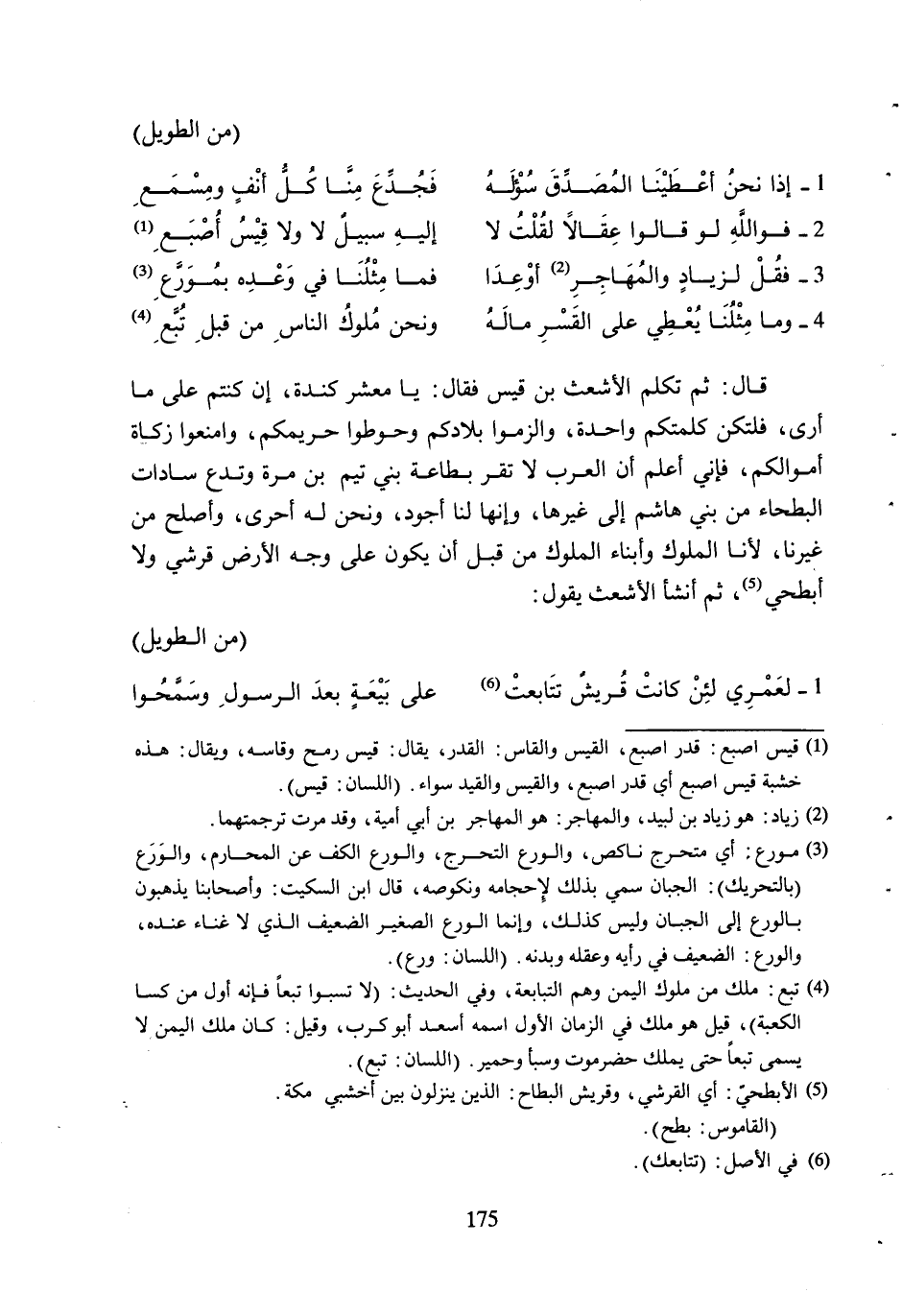 قَالَ: ثُمَّ تَكَلَّمَ الأَشْعَثُ بْنُ قَيْسٍ فَقَالَ: يَا مَعْشَرَ كِنْدَةَ، إِنْ كُنْتُمْ عَلَى مَا أَرَى، فَلْتَكُنْ كَلِمَتُكُمْ وَاحِدَةً، وَالْزَمُوا بِلادَكُمْ وَحَوِّطُوا حَرِيمَكُمْ، وَامْنَعُوا زَكَاةَ أَمْوَالِكُمْ، فَإِنِّي أَعْلَمُ أَنَّ الْعَرَبَ لا تَقَرُّ بِطَاعَةِ بَنِي تَيْمِ بْنِ مُرَّةَ وَتَدَعُ سَادَاتِ الْبَطْحَاءِ مِنْ بَنِي هَاشِمٍ إِلَى غَيْرِهَا، وَإِنَّهَا لَنَا أَجْوَدُ، وَنَحْنُ لَهُ أَحْرَى، وَأَصْلَحُ مِنْ غَيْرِنَا، لأَنَّا الْمُلُوكُ وَأَبْنَاءُ الْمُلُوكِ مِنْ قَبْلِ أَنْ يَكُونَ عَلَى وَجْهِ الأَرْضِ قُرَشِيٌّ وَلا أَبْطَحِيٌّ [5] ، ثُمَّ أَنْشَأَ الأَشْعَثُ يَقُولُ:
