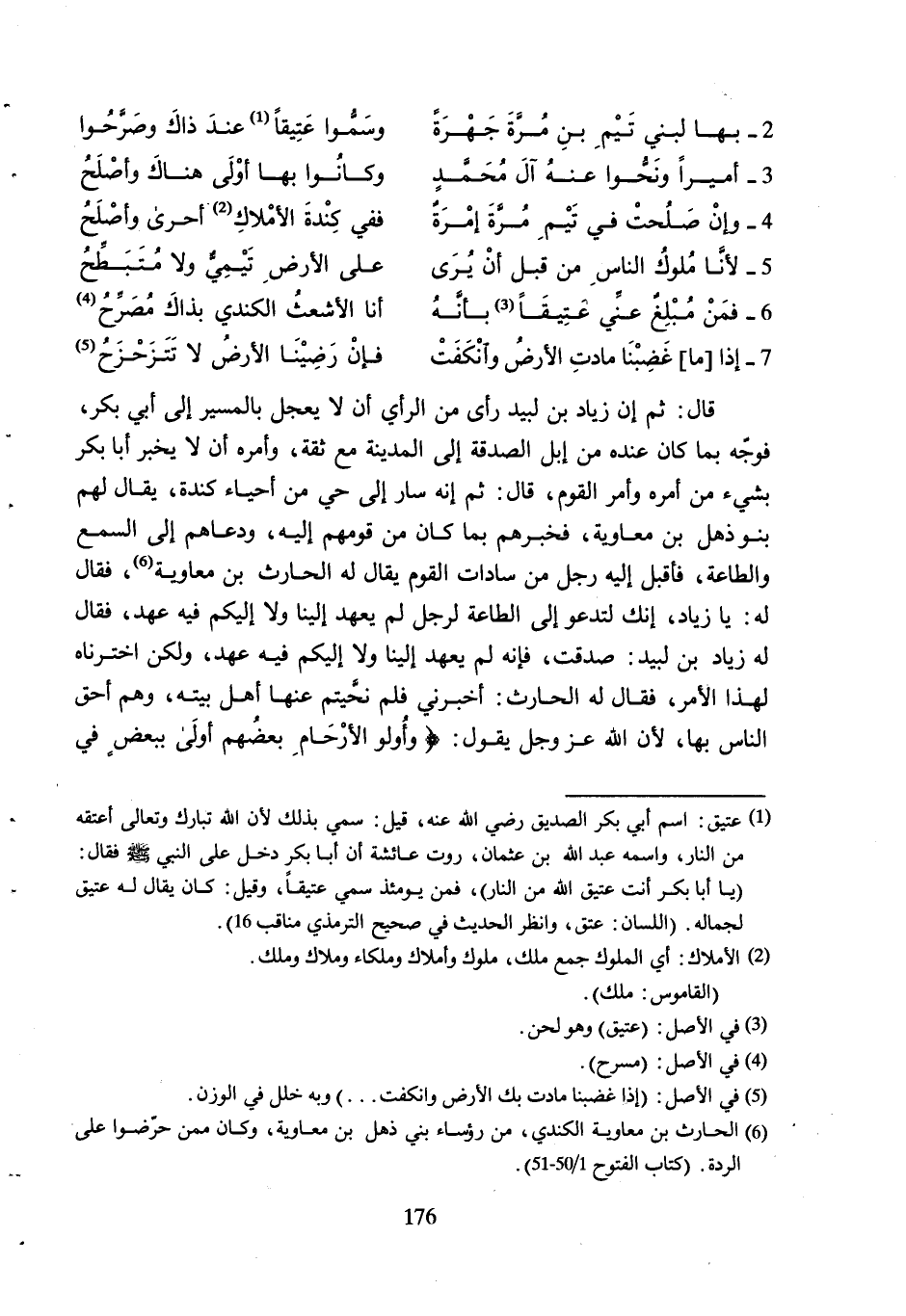 [6] الحارث بن معاوية الكندي، من رؤساء بني ذهل بن معاوية، وكان ممن حرضوا على الردة. (كتاب الفتوح 1/ 50- 51) .