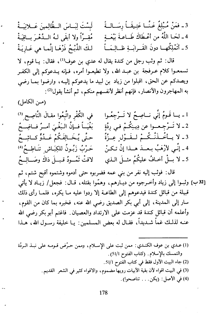 قَالَ: ثُمَّ وَثَبَ رَجُلٌ مِنْ كِنْدَةَ يُقَالُ لَهُ عَدِيُّ بْنُ عَوْفٍ [1] ، فَقَالَ: يَا قَوْمِ، لا تَسْمَعُوا كَلامَ عَرْفَجَةَ بْنِ عَبْدِ اللَّهِ، وَلا تُطِيعُوا أَمْرَهُ، فَإِنَّهُ يَدْعُوكُمْ إِلَى الْكُفْرِ وَيَصُدُّكُمْ عَنِ الْحَقِّ، اقْبَلُوا مِنْ زِيَادِ بْنِ لَبِيدٍ مَا يَدْعُوكُمْ إِلَيْهِ، وَارْضَوْا بِمَا رَضِيَ بِهِ الْمُهَاجِرُونَ وَالأَنْصَارُ، فَإِنَّهُمْ أَنْظَرُ لأَنْفُسِهِمْ مِنْكُمْ، ثُمَّ أَنْشَأَ يَقُولُ [2] :