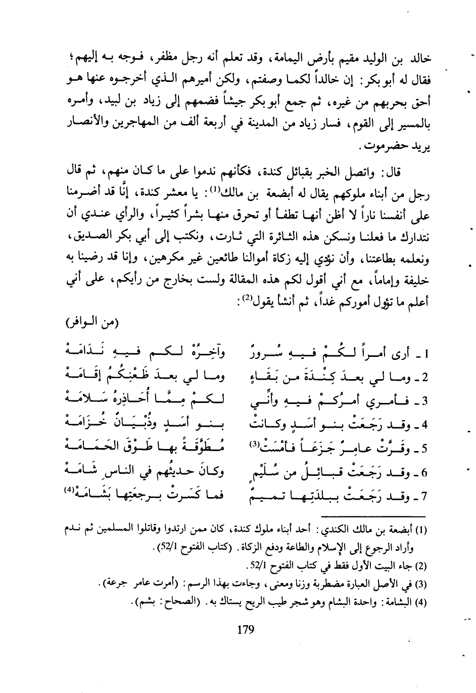 قَالَ: وَاتَّصَلَ الْخَبَرُ بِقَبَائِلَ كِنْدَةَ، فَكَأَنَّهُمْ نَدِمُوا عَلَى مَا كَانَ مِنْهُمْ، ثُمَّ قَالَ رَجُلٌ مِنْ أَبْنَاءِ مُلُوكِهِمْ يُقَالُ لَهُ أَبْضَعَةُ بْنُ مَالِكٍ [1] : يَا مَعْشَرَ كِنْدَةَ، إِنَّا قَدْ أَضْرَمْنَا عَلَى أَنْفُسِنَا نَارًا لا أَظُنُّ أَنَّهَا تُطْفَأُ أَوْ تَحْرِقُ مِنْهَا بَشَرًا كَثِيرًا، وَالرَّأْيُ عِنْدِي أَنْ نَتَدَارَكَ مَا فَعَلْنَا وَنُسْكِنَ هَذِهِ الثَّائِرَةَ الَّتِي ثَارَتْ، وَنَكْتُبُ إِلَى أَبِي بَكْرٍ الصِّدِّيقِ، وَنُعْلِمُهُ بِطَاعَتِنَا، وَأَنْ نُؤَدِّيَ إِلَيْهِ زَكَاةَ أَمْوَالِنَا طَائِعِينَ غَيْرَ مُكْرَهِينَ، وَإِنَّا قَدْ رَضِينَا بِهِ خَلِيفَةً وَإِمَامًا، مَعَ أَنِّي أَقُولُ لَكُمْ هَذِهِ الْمَقَالَةَ وَلَسْتُ بِخَارِجٍ مِنْ رَأْيِكُمْ، على أني أعلم ما تؤول أُمُورُكُمْ غَدًا، ثُمَّ أَنْشَأَ يَقُولُ [2] :