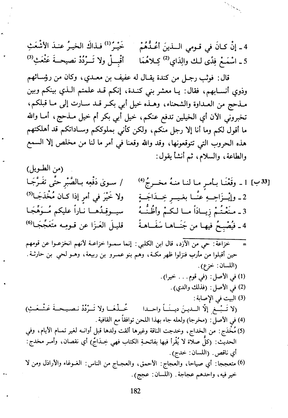 5- اسْمَعْ فِدًى لَكَ وَالِدَايَ [2] كِلاهُمَا ... أَقْبِلْ وَلا تَرْدُدْ نَصِيحَةَ عَثْعَثِ [3]
