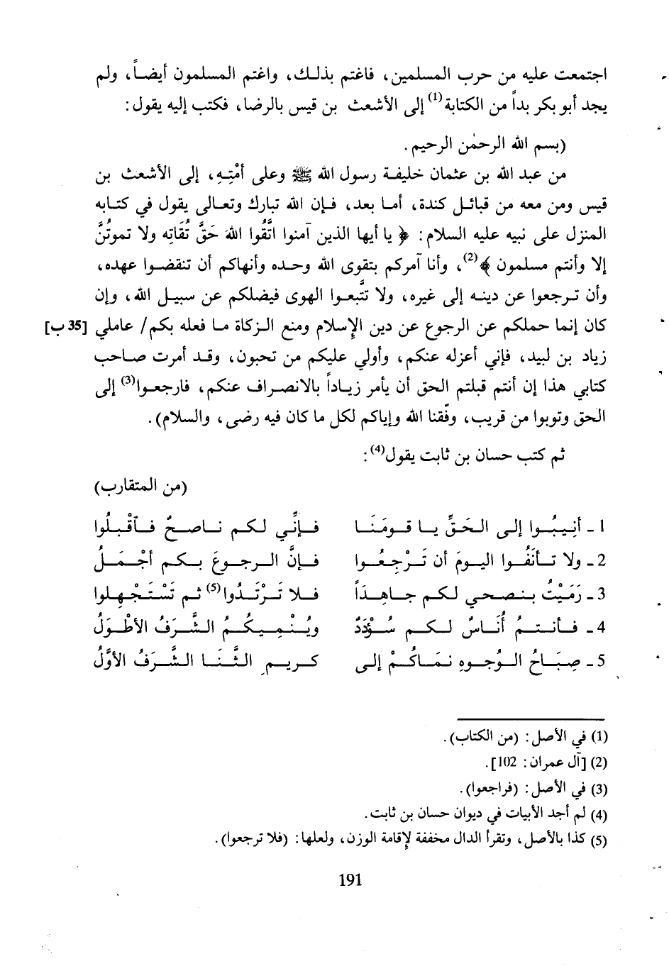 من عبد الله بن عثمان خليفة رسول الله صلّى الله عليه وآله وَسَلَّمَ وَعَلَى أُمَّتِهِ، إِلَى الأَشْعَثِ بْنِ قَيْسٍ وَمَنْ مَعَهُ مِنْ قَبَائِلِ كِنْدَةَ، أَمَّا بَعْدُ، فَإِنَّ اللَّهَ تَبَارَكَ وَتَعَالَى يَقُولُ فِي كِتَابِهِ المنزل على نبيه عليه السلام: يا أَيُّهَا الَّذِينَ آمَنُوا اتَّقُوا اللَّهَ حَقَّ تُقاتِهِ وَلا تَمُوتُنَّ إِلَّا وَأَنْتُمْ مُسْلِمُونَ 3: 102 [2] ، وَأَنَا آمُرُكُمْ بِتَقْوَى اللَّهِ وَحْدَهُ وَأَنْهَاكُمْ أَنْ تَنْقُضُوا عَهْدَهُ، وَأَنْ تَرْجِعُوا عَنْ دِينِهِ إِلَى غَيْرِهِ، وَلا تَتَّبِعُوا الْهَوَى فَيُضِلَّكُمْ عَنْ سَبِيلِ اللَّهِ، وَإِنْ كَانَ إِنَّمَا حَمَلَكُمْ عَنِ الرُّجُوعِ عَنْ دِينِ الإِسْلامِ وَمَنْعِ الزَّكَاةِ مَا فَعَلَهُ بكم/ عاملي [35 ب] زِيَادُ بْنُ لَبِيدٍ، فَإِنِّي أَعْزِلُهُ عَنْكُمْ، وَأُوَلِّي عَلَيْكُمْ مَنْ تُحِبُّونَ، وَقَدْ أَمَرْتُ صَاحِبَ كِتَابِي هَذَا إِنْ أَنْتُمْ قَبِلْتُمُ الْحَقَّ أَنْ يَأْمُرَ زِيَادًا بِالانْصِرَافِ عَنْكُمْ، فَارْجِعُوا [3] إِلَى الْحَقِّ وَتُوبُوا مِنْ قَرِيبٍ، وَفَّقَنَا اللَّهُ وَإِيَّاكُمْ لِكُلِّ مَا كَانَ فِيهِ رِضًى، وَالسَّلامُ) .