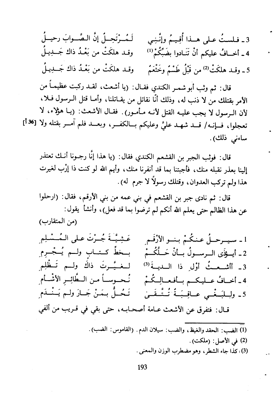 قَالَ: ثُمَّ وَثَبَ أَبُو شِمْرٍ الْكِنْدِيُّ فَقَالَ: (يَا أَشْعَثُ، لَقَدْ رَكِبْتَ عَظِيمًا مِنَ الأَمْرِ بِقَتْلِكَ مَنْ لا ذَنْبَ لَهُ، وَذَلِكَ أَنَّا نُقَاتِلُ مَنْ يُقَاتِلُنَا، وَأَمَّا قَتْلُ الرَّسُولِ فَلا، لأَنَّ الرَّسُولَ لا يَجِبُ عَلَيْهِ الْقَتْلُ لأَنَّهُ مَأْمُورٌ) . فَقَالَ الأَشْعَثُ: (يَا هَؤُلاءِ، لا تَعْجَلُوا، فَإِنَّهُ/ قَدْ شَهِدَ عَلَيَّ وَعَلَيْكُمْ بِالْكُفْرِ، وَبَعْدُ فَلَمْ آمُرْ بِقَتْلِهِ ولا [36 أ] سَاءَنِي ذَلِكَ) .