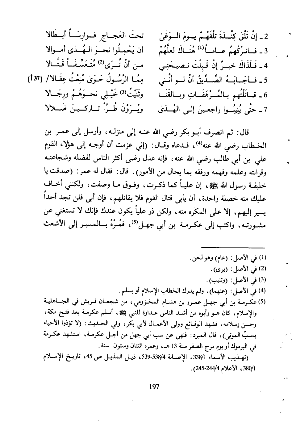 5- فَأَجابَهُ الصِّدِّيقُ أَنْ لَوْ أَنَّنِي ... مِمَّا الرّسول حوى منعت عقالا/ [37 أ]