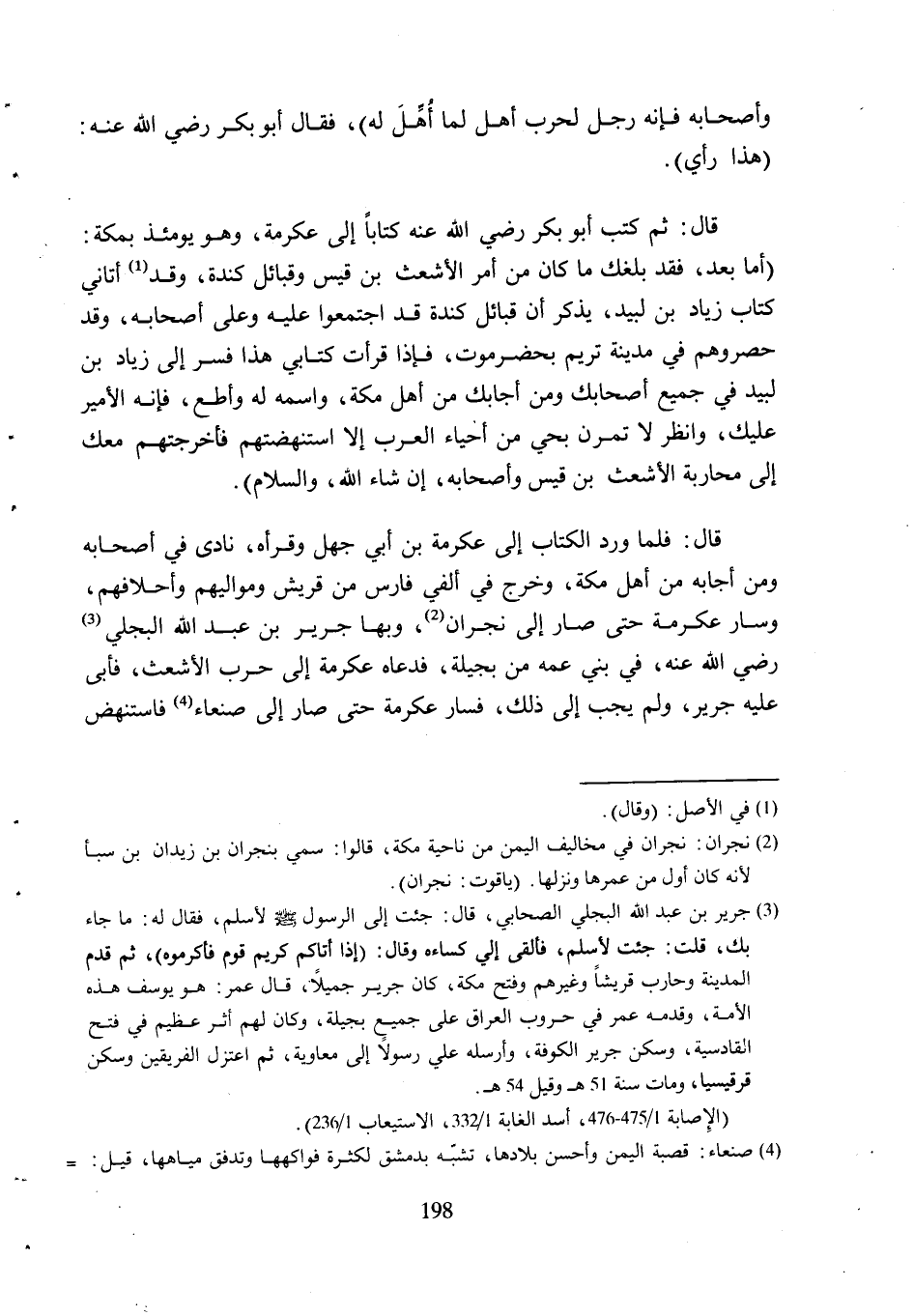 قَالَ: فَلَمَّا وَرَدَ الْكِتَابُ إِلَى عِكْرِمَةَ بْنِ أَبِي جَهْلٍ وَقَرَأَهُ، نَادَى فِي أَصْحَابِهِ وَمَنْ أَجَابَهُ مِنْ أَهْلِ مَكَّةَ، وَخَرَجَ فِي أَلْفَيْ فَارِسٍ مِنْ قُرَيْشٍ وَمَوَالِيهِمْ وَأَحْلافِهِمْ، وَسَارَ عِكْرِمَةُ حَتَّى صَارَ إِلَى نَجْرَانَ [2] ، وَبِهَا جَرِيرُ بْنُ عَبْدِ اللَّهِ الْبَجَلِيُّ [3] رَضِيَ اللَّهُ عَنْهُ، فِي بَنِي عَمِّهِ مِنْ بَجِيلَةَ، فَدَعَاهُ عِكْرِمَةُ إِلَى حَرْبِ الأَشْعَثِ، فَأَبَى عَلَيْهِ جَرِيرٌ، وَلَمْ يُجِبْ إِلَى ذَلِكَ، فَسَارَ عِكْرِمَةُ حَتَّى صَارَ إِلَى صَنْعَاءَ [4] فَاسْتَنْهَضَ