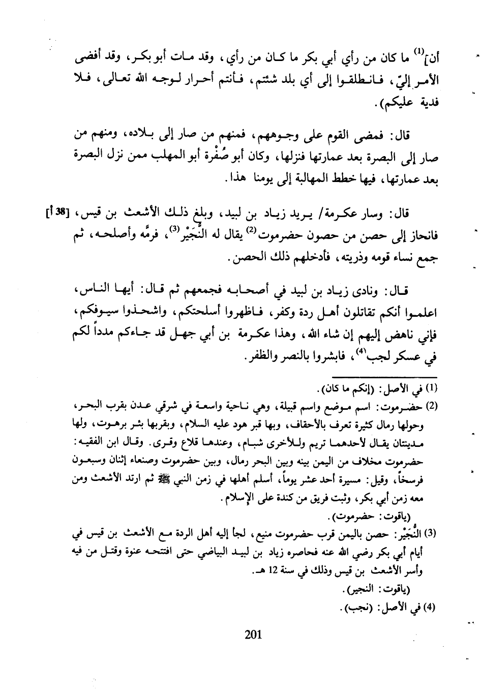 قَالَ: وَسَارَ عِكْرِمَةُ/ يُرِيدُ زِيَادَ بْنَ لَبِيدٍ، وَبَلَغَ ذَلِكَ الأَشْعَثَ بْنَ قيس، [38 أ] فَانْحَازَ إِلَى حِصْنٍ مِنْ حُصُونِ حَضْرَمَوْتَ [2] يُقَالُ لَهُ النُّجَيْرُ [3] ، فَرَمَّهُ وَأَصْلَحَهُ، ثُمَّ جَمَعَ نِسَاءَ قَوْمِهِ وَذُرِّيَّتَهُ، فَأَدْخَلَهُمْ ذَلِكَ الْحِصْنَ.
