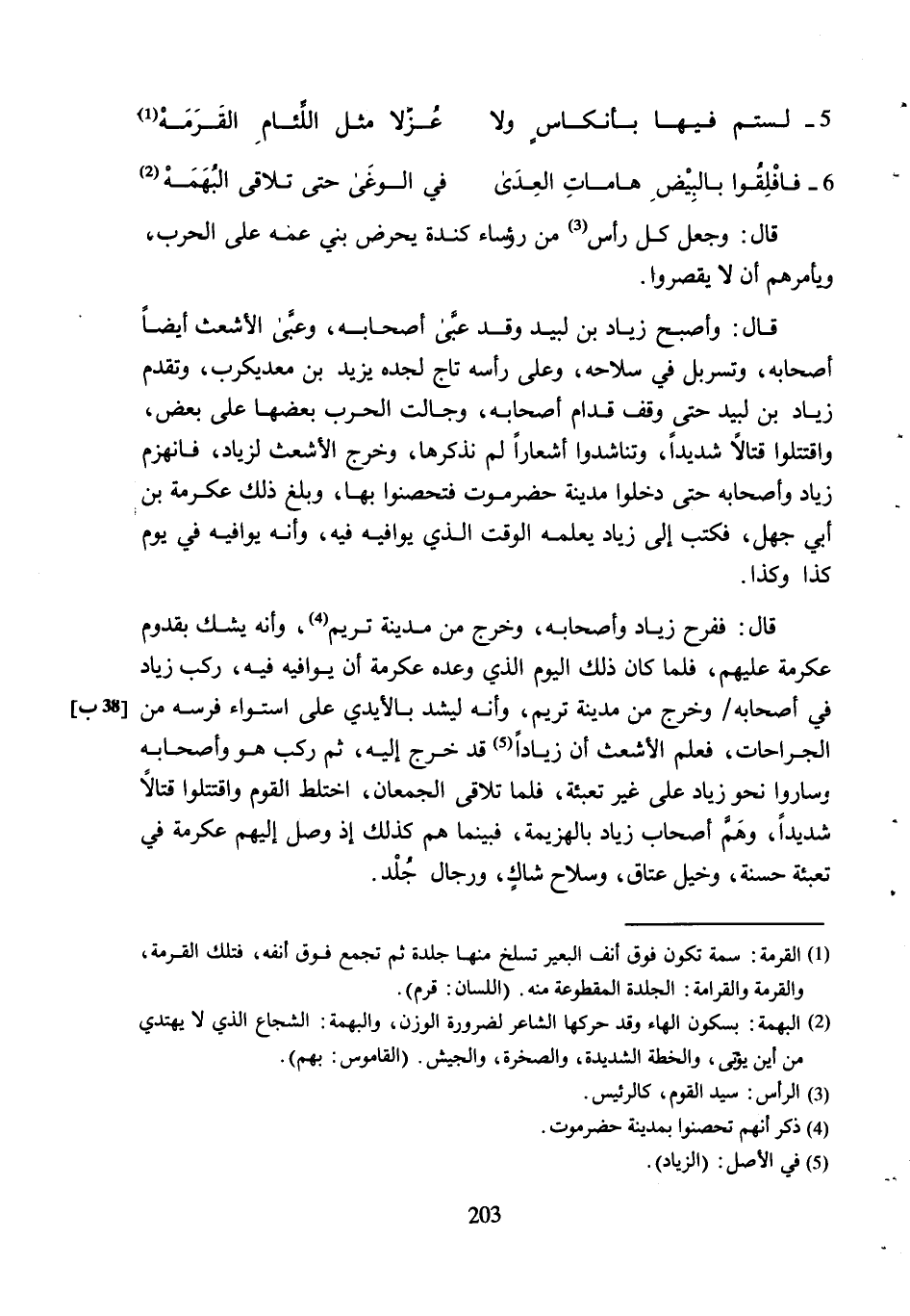 قَالَ: فَفَرِحَ زِيَادٌ وَأَصْحَابُهُ، وَخَرَجَ مِنْ مَدِينَةِ تِرْيَمَ [4] ، وَأَنَّهُ يَشُكُّ بِقُدُومِ عِكْرِمَةَ عَلَيْهِمْ، فَلَمَّا كَانَ ذَلِكَ الْيَوْمُ الَّذِي وَعَدَهُ عِكْرِمَةُ أَنْ يُوَافِيَهُ فِيهِ، رَكِبَ زِيَادٌ فِي أَصْحَابِهِ/ وَخَرَجَ مِنْ مَدِينَةِ تِرْيَمَ، وَأَنَّهُ ليشد بالأيدي على استواء فرسه من [38 ب] الْجِرَاحَاتِ، فَعَلِمَ الأَشْعَثُ أَنَّ زِيَادًا [5] قَدْ خَرَجَ إِلَيْهِ، ثُمَّ رَكِبَ هُوَ وَأَصْحَابُهُ وَسَارُوا نَحْوَ زِيَادٍ عَلَى غَيْرِ تَعْبِئَةٍ، فَلَمَّا تَلاقَى الْجَمْعَانِ، اخْتَلَطَ الْقَوْمُ وَاقْتَتَلُوا قِتَالا شَدِيدًا، وَهُمْ أَصْحَابُ زِيَادٍ بِالْهَزِيمَةِ، فَبَيْنَمَا هُمْ كَذَلِكَ إِذْ وَصَلَ إِلَيْهِمْ عِكْرِمَةُ فِي تَعْبِئَةٍ حَسَنَةٍ، وَخَيْلٍ عِتَاقٍ، وسلاح شاك، ورجال جلد.
