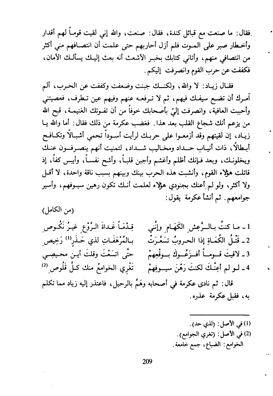 فَقَالَ زِيَادٌ: لا وَاللَّهِ، وَلَكِنَّكَ جَبُنْتَ وَضَعُفْتَ وَكَفَفْتَ عَنِ الْحَرْبِ، أَلَمْ آمُرْكَ أَنْ تَضَعَ سَيْفَكَ فِيهِمْ، ثُمَّ لا تَرْفَعْهُ عَنْهُمْ وَفِيهِمْ عَيْنٌ تَطْرُفُ، فَعَصَيْتَنِي وَأَحْبَبْتَ الْعَافِيَةَ، وَانْصَرَفْتَ إِلَيَّ بِأَصْحَابِكَ خَوْفًا مِنْ أَنْ تَفُوتَكَ الْغَنِيمَةُ، قَبَّحَ اللَّهُ مَنْ يَزْعُمُ أَنَّكَ شُجَاعُ الْقَلْبِ بَعْدَ هَذَا. فَغَضِبَ عِكْرِمَةُ مِنْ ذَلِكَ فَقَالَ: أَمَا وَاللَّهِ يَا زِيَادُ، إِنْ لَقِيتَهُمْ وَقَدْ أَزْمَعُوا عَلَى حَرْبِكَ لَرَأَيْتَ أُسُودًا تَحْمِي أَشْبَالا وَتُكَافِحُ أَبْطَالا، ذَاتَ أَنْيَابٍ حِدَادٍ وَمَخَالِيبَ شِدَادٍ، لَتَمَنَّيْتَ أَنَّهُمْ يَنْصَرِفُونَ عَنْكَ وَيُخَلُّونَكَ، وَبَعْدُ فَإِنَّكَ أَظْلَمُ وَأَغْشَمُ وَأَجْبَنُ قَلْبًا، وَأَشَحُّ نَفْسًا، وَأَيْبَسُ كَفًّا، إِذْ قَاتَلْتَ هَؤُلاءِ الْقَوْمَ، وَأَنْشَبْتَ هَذِهِ الْحَرْبَ بَيْنَكَ وَبَيْنَهُمْ بِسَبَبِ نَاقَةٍ وَاحِدَةٍ، لا أَقَلَّ وَلا أَكْثَرَ، وَلَوْ لَمْ أُعِنْكَ بِجُنُودِي هَؤُلاءِ لَعَلِمْتَ أَنَّكَ تَكُونُ رَهِينَ سُيُوفِهِمْ، وَأَسِيرَ جَوَامِعِهِمْ. ثُمَّ أَنْشَأَ عِكْرِمَةُ يَقُولُ: