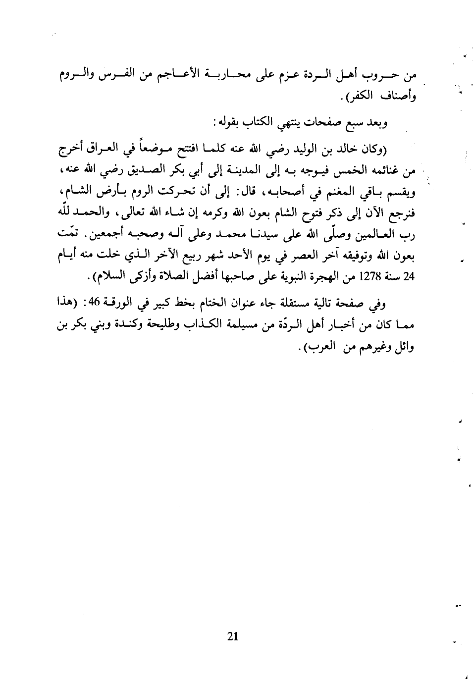 (وَكَانَ خَالِدُ بْنُ الْوَلِيدِ رَضِيَ اللَّهُ عَنْهُ كلما افتتح موضعا في الْعِرَاقِ أَخْرَجَ مِنْ غَنَائِمِهِ الْخُمُسَ فَيُوَجِّهُ بِهِ إِلَى الْمَدِينَةِ إِلَى أَبِي بَكْرٍ الصِّدِّيقِ رَضِيَ اللَّهُ عَنْهُ، وَيُقَسِّمُ بَاقِي الْمَغْنَمِ فِي أَصْحَابِهِ، قَالَ: إِلَى أَنْ تَحَرَّكَتِ الرُّومُ بِأَرْضِ الشَّامِ، فَنَرْجِعُ الآنَ إِلَى ذِكْرِ فُتُوحِ الشَّامِ بِعَوْنِ اللَّهِ وَكَرَمِهِ إِنْ شَاءَ اللَّهُ تَعَالَى، وَالْحَمْدُ للَّه رَبِّ الْعَالَمِينَ وَصَلَّى اللَّهُ عَلَى سَيِّدِنَا مُحَمَّدٍ وَعَلَى آلِهِ وَصَحْبِهِ أَجْمَعِينَ. تمت بعون الله وتوفيقه آخر العصر في يوم الأحد شهر ربيع الآخر الذي خلت منه أيام 24 سنة 1278 من الهجرة النبوية على صاحبها أفضل الصلاة وأزكى السلام) .