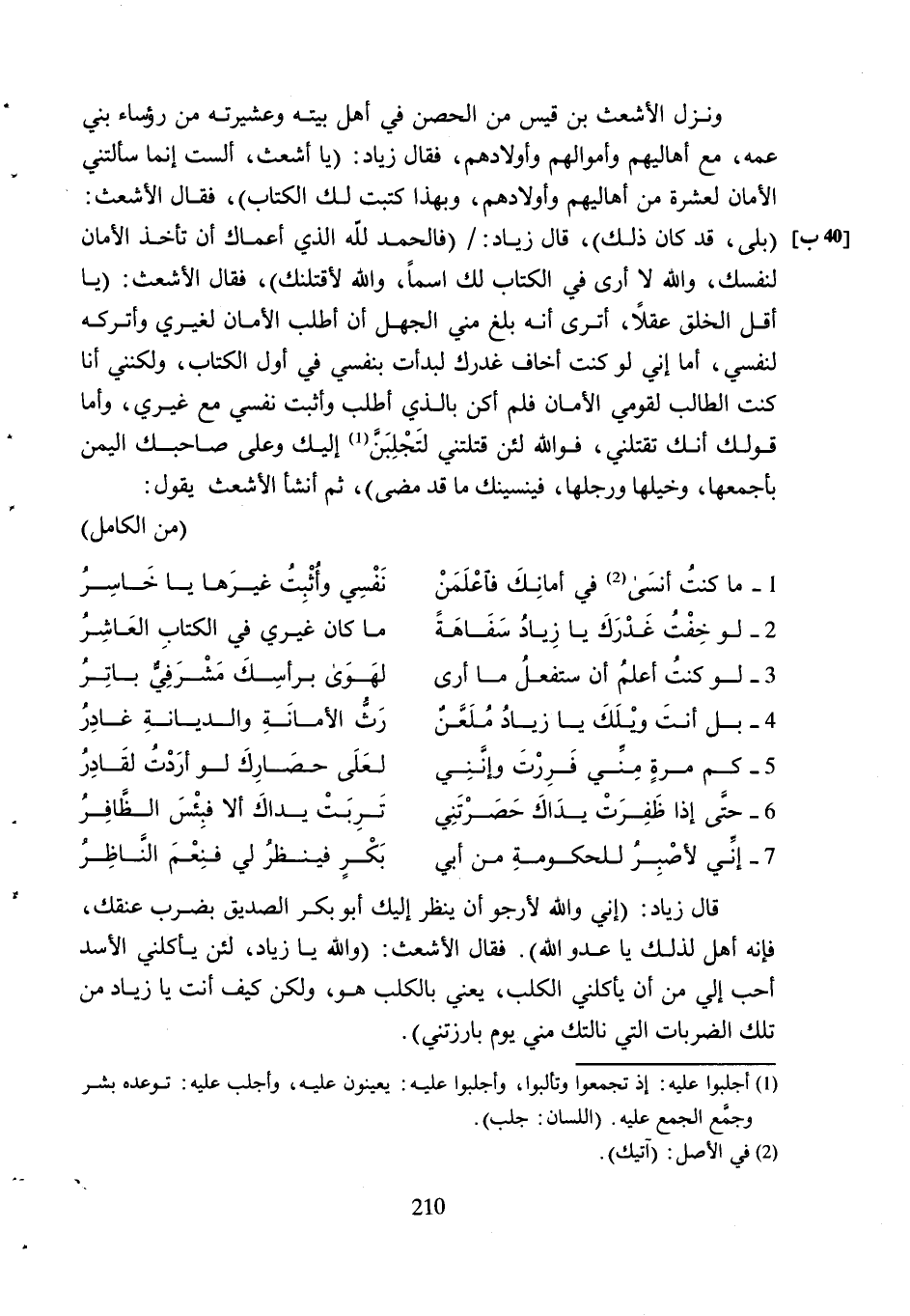 [40 ب] (بَلَى، قَدْ كَانَ ذَلِكَ) ، قَالَ زِيَادٌ: / (فَالْحَمْدُ للَّه الَّذِي أَعْمَاكَ أَنْ تَأْخُذَ الأَمَانَ لِنَفْسِكَ، وَاللَّهِ لا أَرَى فِي الْكِتَابِ لَكَ اسْمًا، وَاللَّهِ لأَقْتُلَنَّكَ) ، فَقَالَ الأَشْعَثُ: (يَا أَقَلَّ الْخَلْقِ عَقْلا، أَتَرَى أَنَّهُ بَلَغَ مِنِّي الْجَهْلُ أَنْ أَطْلُبَ الأَمَانَ لِغَيْرِي وَأَتْرُكَهُ لِنَفْسِي، أَمَا إِنِّي لَوْ كُنْتُ أَخَافُ غَدْرَكَ لَبَدَأْتُ بِنَفْسِي فِي أَوَّلِ الْكِتَابِ، وَلَكِنَّنِي أَنَا كُنْتُ الطَّالِبَ لِقَوْمِي الأَمَانَ فَلَمْ أَكُنْ بِالَّذِي أَطْلُبُ وَأُثْبِتُ نَفْسِي مع غيري، وأما قولك أنك تقتلني، فو الله لَئِنْ قَتَلْتَنِي لَتَجْلِبَنَّ [1] إِلَيْكَ وَعَلَى صَاحِبِكَ الْيَمَنَ بِأَجْمَعِهَا، وَخَيْلَهَا وَرَجْلَهَا، فَيُنْسِيَنَّكَ مَا قَدْ مَضَى) ، ثُمَّ أَنْشَأَ الأَشْعَثُ يَقُولُ: