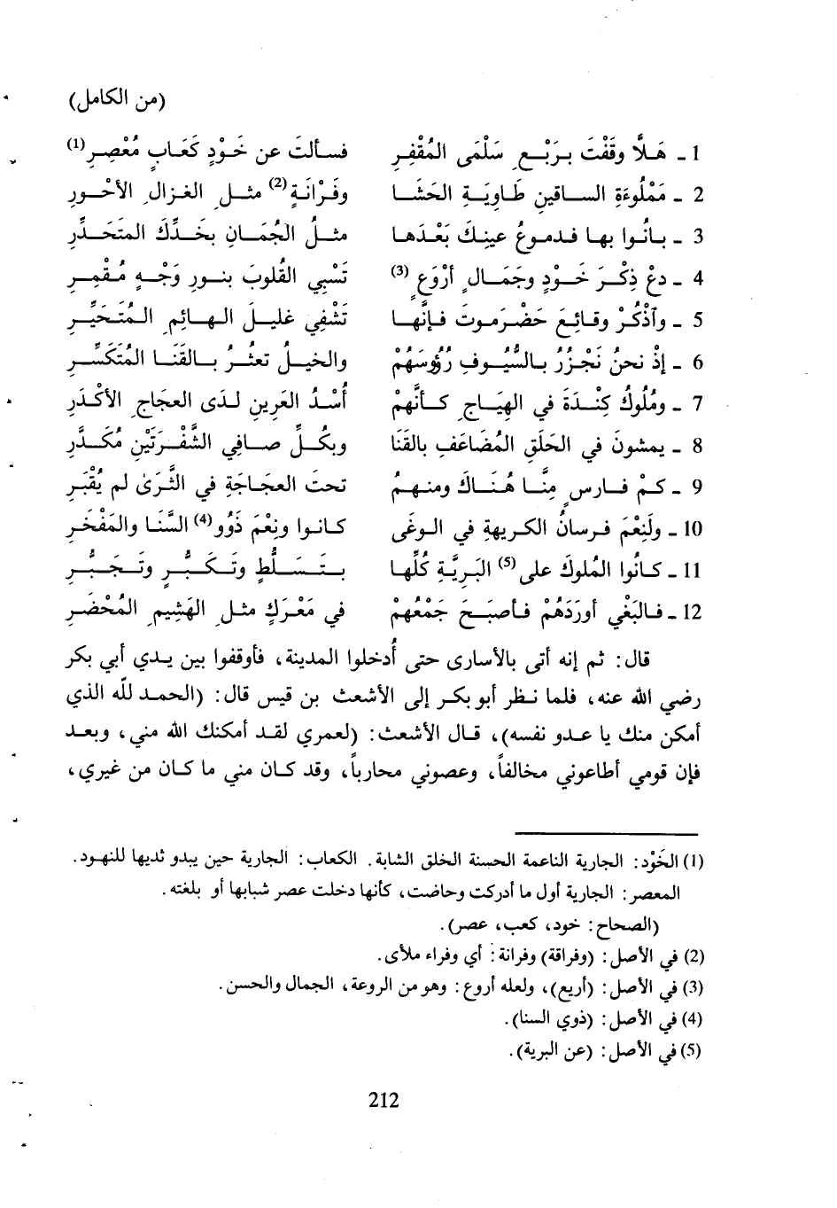 1- هلَّا وَقَفْتَ بِرَبْعِ سَلْمَى الْمُقْفِرِ ... فَسَأَلْتَ عَنْ خَوْدٍ كِعَابٍ مُعْصِرِ [1]