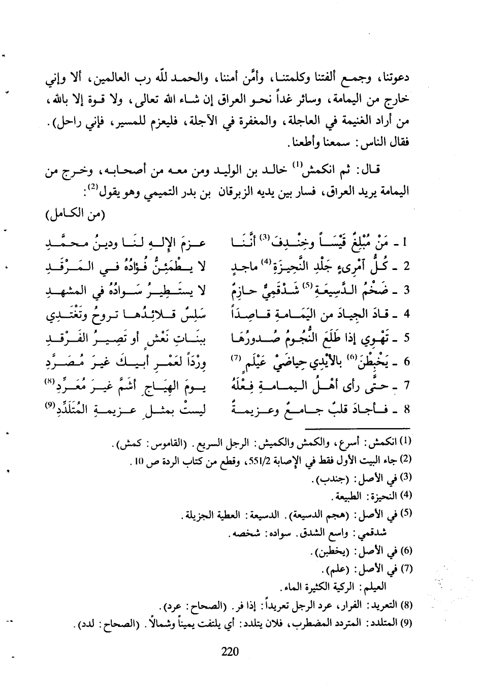 قَالَ: ثُمَّ انْكَمَشَ [1] خَالِدُ بْنُ الْوَلِيدِ وَمَنْ مَعَهُ مِنْ أَصْحَابِهِ، وَخَرَجَ مِنَ الْيَمَامَةِ يُرِيدُ الْعِرَاقَ، فَسَارَ بَيْنَ يَدَيْهِ الزِّبْرِقَانُ بْنُ بَدْرٍ التَّمِيمِيُّ وَهُوَ يَقُولُ [2] :