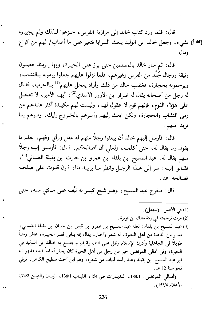 قَالَ: فَأَرْسَلَ إِلَيْهِمْ خَالِدٌ أَنْ يَبْعَثُوا رَجُلا مِنْهُمْ لَهُ عَقْلٌ وَرَأْيٌ وَفَهْمٌ، يَعْلَمُ مَا يَقُولُ وَمَا يُقَالُ لَهُ، حَتَّى أُكَلِّمَهُ، وَلَعَلِّي أَنْ أُصَالِحَكُمْ. قَالَ: فَأَرْسَلُوا إِلَيْهِ رَجُلا مِنْهُمْ يُقَالُ لَهُ: عَبْدُ الْمَسِيحِ بْنُ بَلْقَاءَ بْنِ عَمْرِو بْنِ حَارِثِ بْنِ بَقِيلَةَ الْغَسَّانِيُّ [3] ، فَقَالُوا إِلَيْهِ: سِرْ إِلَى هَذَا الرَّجُلِ وَانْظُرْ مَا يُرِيدُ مِنَّا، فَإِنْ قَدِرْتَ عَلَى صُلْحِهِ فَصَالِحْهُ عَنَّا.