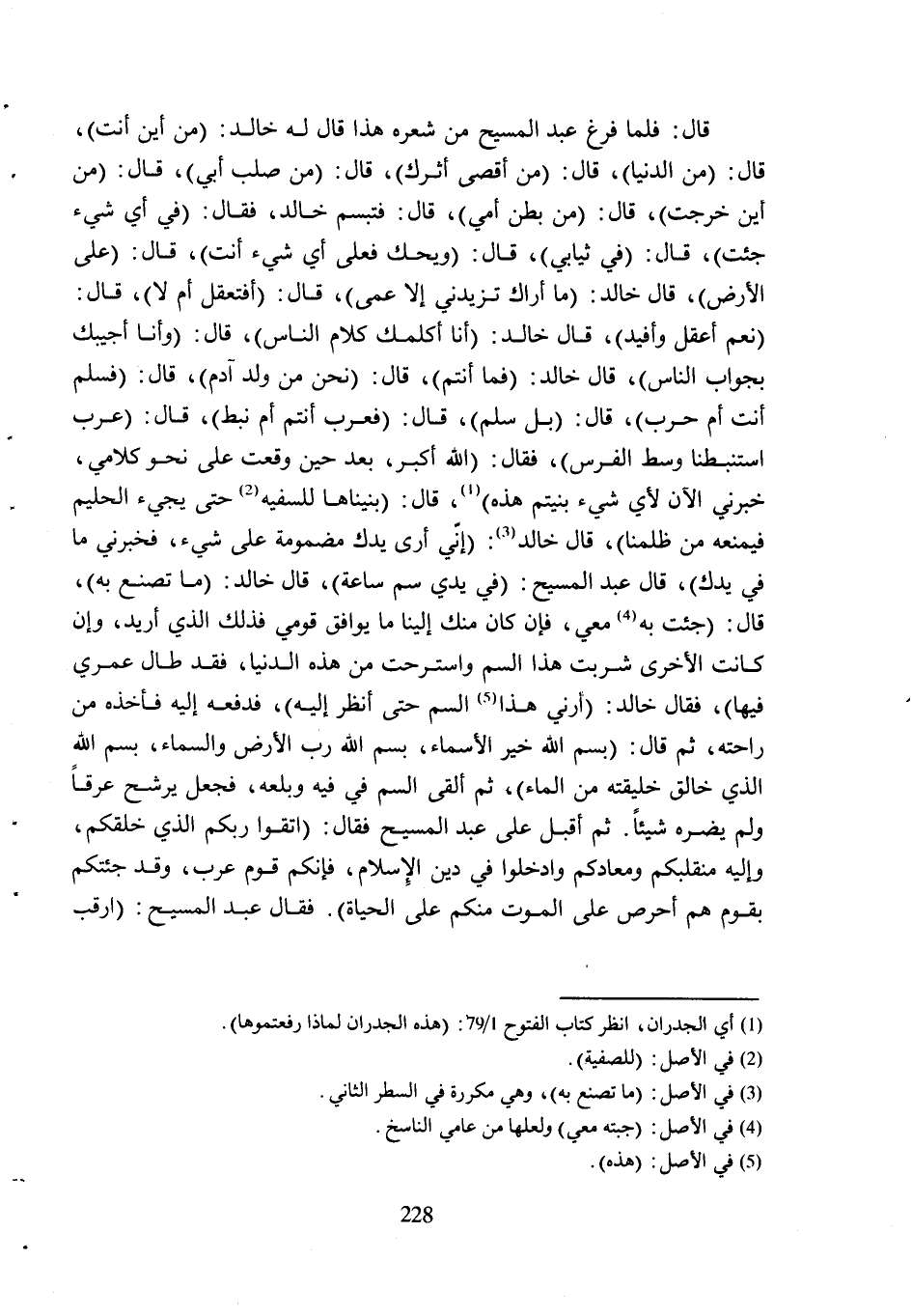 (نَعَمْ أَعْقِلُ وَأُفِيدُ) ، قَالَ خَالِدٌ: (أَنَا أُكَلِّمُكَ كَلامَ النَّاسِ) ، قَالَ: (وَأَنَا أُجِيبُكَ بِجَوَابِ النَّاسِ) ، قَالَ خَالِدٌ: (فَمَا أَنْتُمْ) ، قَالَ: (نَحْنُ مِنْ وَلَدِ آدَمَ) ، قَالَ: (فَسِلْمٌ أَنْتَ أَمْ حَرْبٌ) ، قَالَ: (بَلْ سِلْمٌ) ، قَالَ: (فَعَرَبٌ أَنْتُمْ أَمْ نَبَطٌ) ، قَالَ: (عَرَبٌ اسْتُنْبِطْنَا وَسْطَ الْفُرْسِ) ، فَقَالَ: (اللَّهُ أَكْبَرُ، بَعْدَ حِينٍ وَقَعْتَ عَلَى نَحْوِ كَلامِي، خَبِّرْنِي الآنَ لأَيِّ شَيْءٍ بَنَيْتُمْ هَذِهِ) [1] ، قَالَ: (بَنَيْنَاهَا لِلسَّفِيهِ [2] حَتَّى يَجِيءَ الْحَلِيمُ فَيَمْنَعُهُ مِنْ ظُلْمِنَا) ، قَالَ خَالِدٌ [3] : (إِنِّي أَرَى يَدَكَ مَضْمُومَةً عَلَى شَيْءٍ، فَخَبِّرْنِي مَا فِي يَدِكَ) ، قَالَ عَبْدُ الْمَسِيحِ: (فِي يَدِي سُمُّ سَاعَةٍ) ، قَالَ خَالِدٌ: (مَا تَصْنَعُ بِهِ) ، قَالَ: (جِئْتُ بِهِ [4] مَعِي، فَإِنْ كَانَ مِنْكَ إِلَيْنَا مَا يُوَافِقُ قَوْمِي فَذَلِكَ الَّذِي أُرِيدُ، وَإِنْ كَانَتِ الأُخْرَى شَرِبْتُ هَذَا السُّمَّ وَاسْتَرَحْتُ مِنْ هَذِهِ الدُّنْيَا، فَقَدْ طَالَ عُمْرِي فِيهَا) ، فَقَالَ خَالِدٌ: (أَرِنِي هَذَا [5] السُّمَّ حَتَّى أَنْظُرَ إِلَيْهِ) ، فَدَفَعَهُ إِلَيْهِ فَأَخَذَهُ مِنْ رَاحَتِهِ، ثُمَّ قَالَ: (بِسْمِ اللَّهِ خَيْرِ الأَسْمَاءِ، بِسْمِ اللَّهِ رَبِّ الأَرْضِ وَالسَّمَاءِ، بِسْمِ اللَّهِ الَّذِي خَالِقٌ خَلِيقَتَهُ مِنَ الْمَاءِ) ، ثُمَّ أَلْقَى السُّمَّ فِي فِيهِ وَبَلَعَهُ، فَجَعَلَ يَرْشَحُ عَرَقًا وَلَمْ يَضُرَّهُ شَيْئًا. ثُمَّ أَقْبَلَ عَلَى عَبْدِ الْمَسِيحِ فَقَالَ: (اتَّقُوا رَبَّكُمُ الَّذِي خَلَقَكُمْ، وَإِلَيْهِ مُنْقَلَبُكُمْ وَمَعَادُكُمْ وَادْخُلُوا فِي دِينِ الإِسْلامِ، فَإِنَّكُمْ قَوْمٌ عَرَبٌ، وَقَدْ جِئْتُكُمْ بِقَوْمٍ هُمْ أَحْرَصُ عَلَى الْمَوْتِ مِنْكُمْ عَلَى الْحَيَاةِ) . فَقَالَ عَبْدُ الْمَسِيحِ: (ارْقُبْ