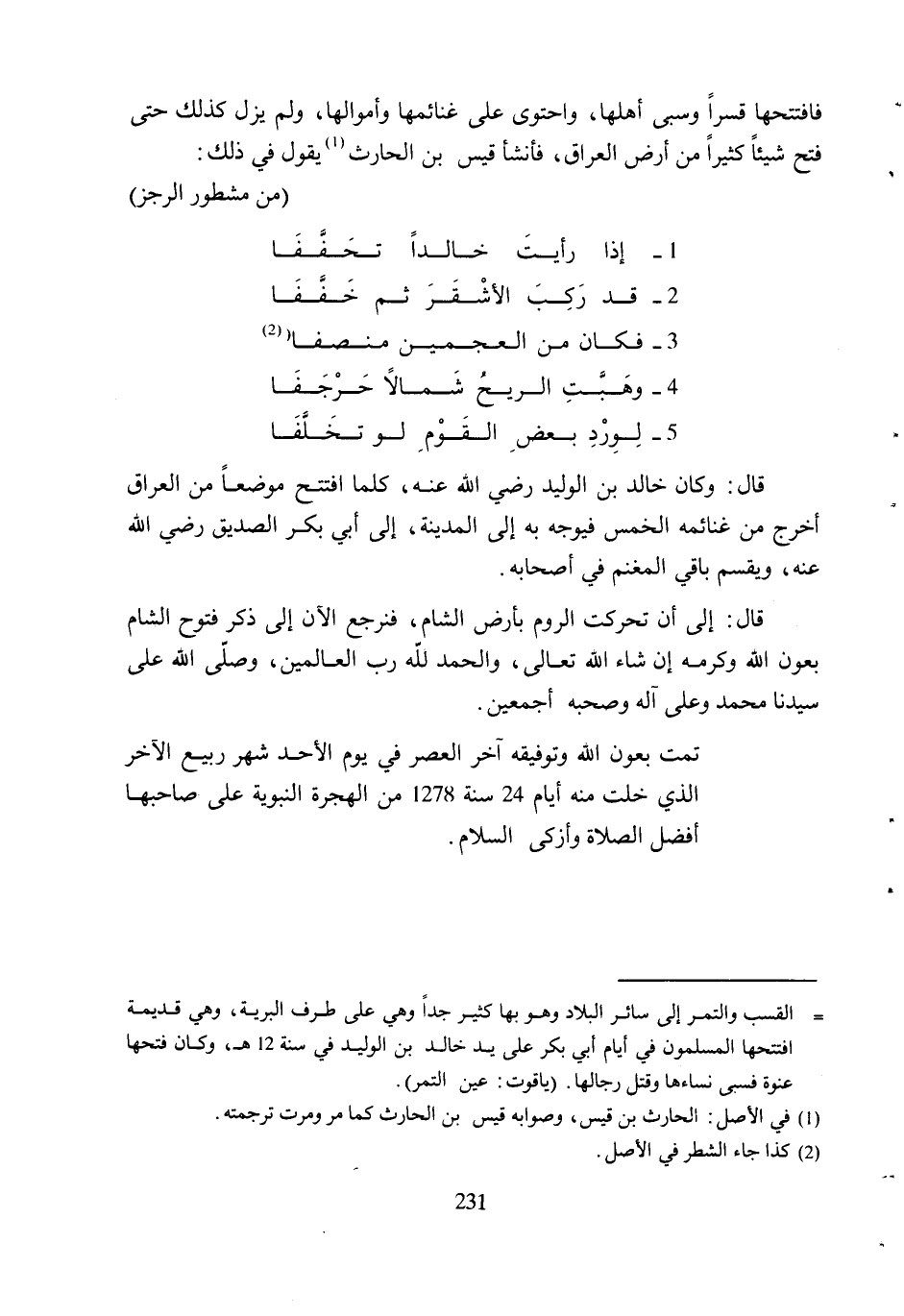 فَافْتَتَحَهَا قَسْرًا وَسَبَى أَهْلَهَا، وَاحْتَوَى عَلَى غَنَائِمِهَا وَأَمْوَالِهَا، وَلَمْ يَزَلْ كَذَلِكَ حَتَّى فَتَحَ شَيْئًا كَثِيرًا مِنْ أَرْضِ الْعِرَاقِ، فَأَنْشَأَ قَيْسُ بْنُ الْحَارِثِ [1] يَقُولُ فِي ذَلِكَ:
