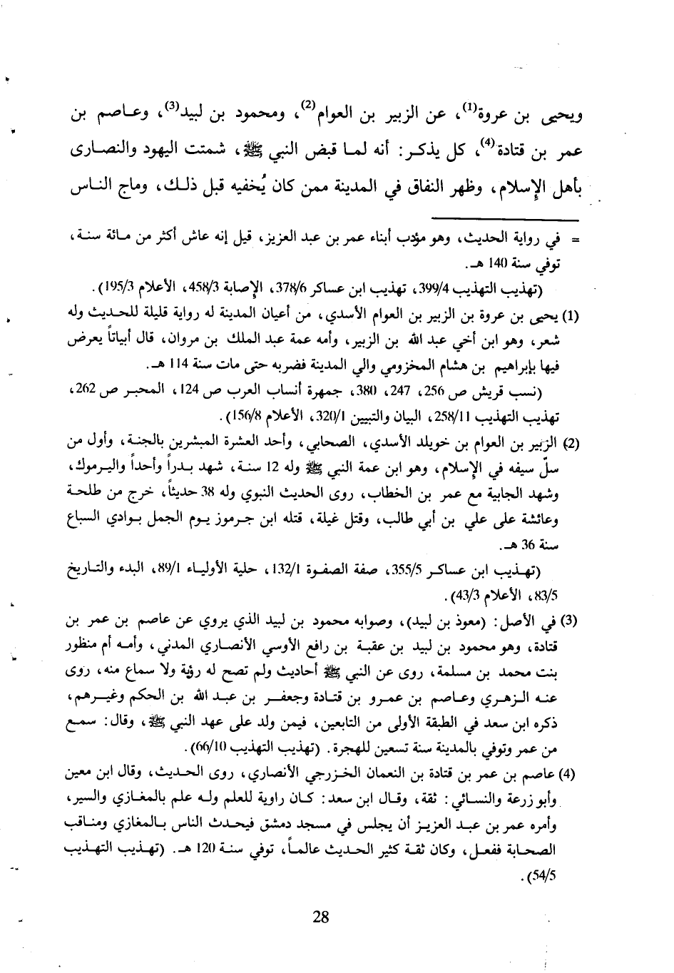 وَيَحْيَى بْنُ عُرْوَةَ [1] ، عَنِ الزُّبَيْرِ بْنِ الْعَوَّامِ [2] ، وَمَحْمُودِ بْنِ لَبِيدٍ [3] ، وَعَاصِمِ بْنِ عُمَرَ بْنِ قَتَادَةَ [4] ، كُلٌّ يَذْكُرُ: أَنَّهُ لَمَّا قُبِضَ النَّبِيُّ صلّى الله عليه وآله وَسَلَّمَ، شَمِتَتِ الْيَهُودُ وَالنَّصَارَى بِأَهْلِ الإِسْلامِ، وَظَهَرَ النِّفَاقُ فِي الْمَدِينَةِ مِمَّنْ كَانَ يُخْفِيهِ قَبْلَ ذلك، وماج الناس