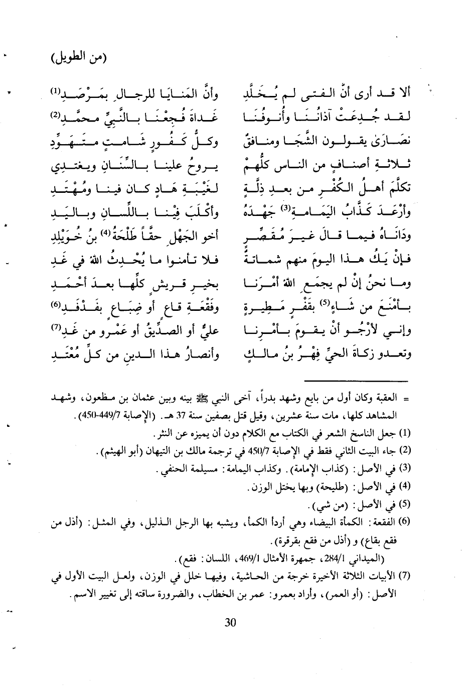 [7] الأبيات الثلاثة الأخيرة خرجة من الحاشية، وفيها خلل في الوزن، ولعل البيت الأول في الأصل: (أو العمر) ، وأراد بعمرو: عمر بن الخطاب، والضرورة ساقته إلى تغيير الاسم.