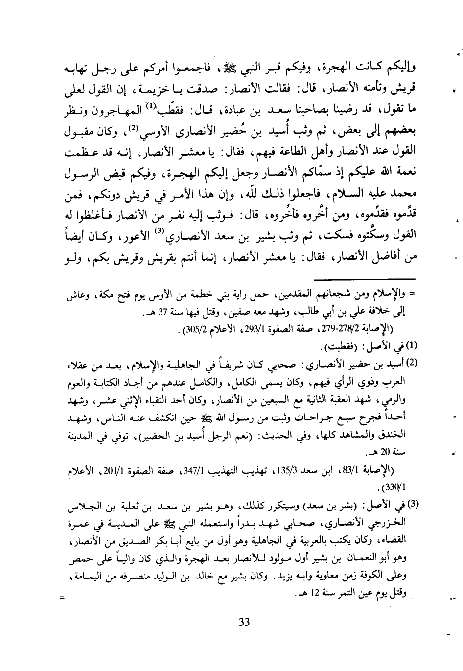 وَإِلَيْكُمْ كَانَتِ الْهِجْرَةُ، وَفِيكُمْ قَبْرُ النَّبِيِّ صَلَّى الله عليه وآله وَسَلَّمَ، فَاجْمَعُوا أَمْرَكُمْ عَلَى رَجُلٍ تَهَابُهُ قُرَيْشٌ وَتَأْمَنُهُ الأَنْصَارُ، قَالَ: فَقَالَتِ الأَنْصَارُ: صَدَقْتَ يَا خُزَيْمَةُ، إِنَّ الْقَوْلَ لَعَلَى مَا تَقُولُ، قَدْ رَضِينَا بِصَاحِبِنَا سَعْدِ بْنِ عُبَادَةَ، قَالَ: فَقَطَّبَ [1] الْمُهَاجِرُونَ وَنَظَرَ بَعْضُهُمْ إِلَى بَعْضٍ، ثُمَّ وَثَبَ أُسَيْدُ بْنُ حُضَيْرٍ الأَنْصَارِيُّ الأَوْسِيُّ [2] ، وَكَانَ مَقْبُولَ الْقَوْلِ عِنْدَ الأَنْصَارِ وَأَهْلِ الطَّاعَةِ فِيهِمْ، فَقَالَ: يَا مَعْشَرَ الأَنْصَارِ، إِنَّهُ قَدْ عَظُمَتْ نِعْمَةُ اللَّهِ عَلَيْكُمْ إِذْ سَمَّاكُمُ الأَنْصَارَ وَجَعَلَ إِلَيْكُمُ الْهِجْرَةَ، وَفِيكُمْ قُبِضَ الرَّسُولُ مُحَمَّدٌ عَلَيْهِ السَّلامُ، فَاجْعَلُوا ذَلِكَ للَّه، وَإِنَّ هَذَا الأَمْرَ فِي قُرَيْشٍ دُونَكُمْ، فَمَنْ قَدَّمُوهُ فَقَدِّمُوهُ، وَمَنْ أَخَّرُوهُ فَأَخِّرُوهَ، قَالَ: فَوَثَبَ إِلَيْهِ نَفَرٌ مِنَ الأَنْصَارِ فَأَغْلَظُوا لَهُ الْقَوْلَ وَسَكَّتُوهُ فَسَكَتَ، ثُمَّ وَثَبَ بَشِيرُ بْنُ سَعْدٍ الأَنْصَارِيُّ [3] الأَعْوَرُ، وَكَانَ أَيْضًا مِنْ أَفَاضِلِ الأَنْصَارِ، فَقَالَ: يَا مَعْشَرَ الأَنْصَاِر، إنما أنتم بقريش وقريش بكم، ولو