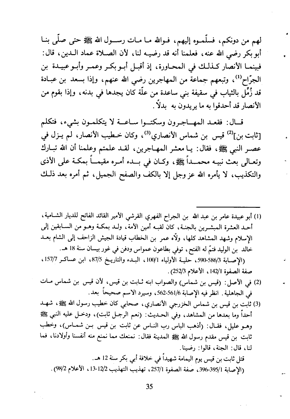 قَالَ: فَقَعَدَ الْمُهَاجِرُونَ وَسَكَتُوا سَاعَةً لا يَتَكَلَّمُونَ بِشَيْءٍ، فَتَكَلَّمَ [ثَابِتُ بْنُ] [2] قَيْسِ بْنِ شَمَّاسٍ الأَنْصَارِيُّ [3] ، وَكَانَ خَطِيبَ الأَنْصَارِ، لَمْ يَزَلْ فِي عَصْرِ النَّبِيِّ صلّى الله عليه وآله وَسَلَّمَ، فَقَالَ: يَا مَعْشَرَ الْمُهَاجِرِينَ، لَقَدْ عَلِمْتُمْ وَعَلِمْنَا أَنَّ اللَّهَ تَبَارَكَ وَتَعَالَى بَعَثَ نَبِيَّهُ محمدا صلّى الله عليه وآله وَسَلَّمَ، وَكَانَ فِي بَدْءِ أَمْرِهِ مُقِيمًا بِمَكَّةَ عَلَى الأَذَى وَالتَّكْذِيبِ، لا يَأْمُرُهُ اللَّهُ عَزَّ وَجَلَّ إِلا بِالْكَفِّ وَالصَّفْحِ الْجَمِيلِ، ثُمَّ أَمَرَهُ بعد ذلك