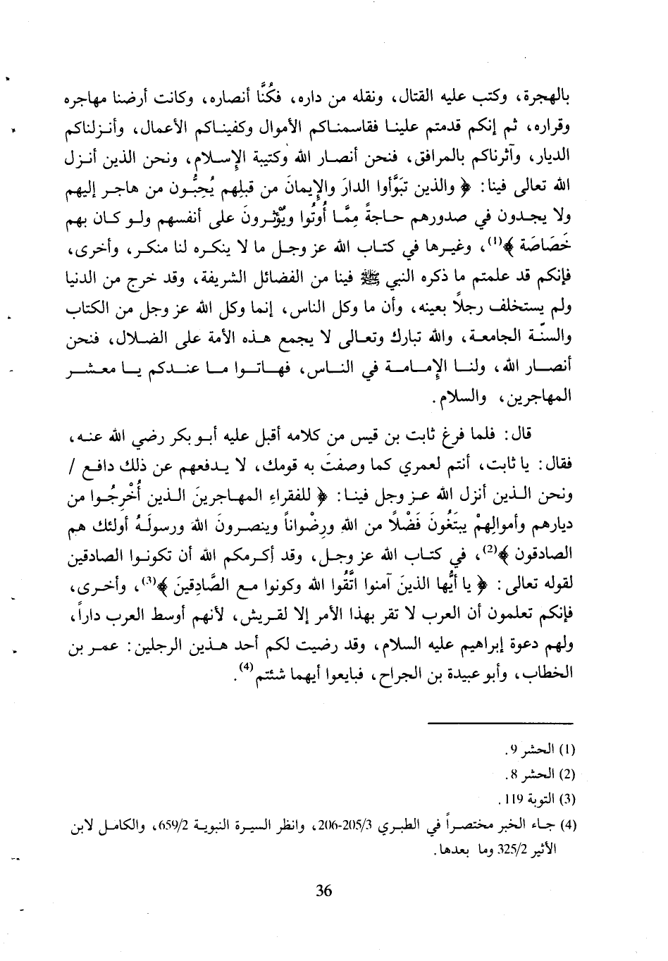 قَالَ: فَلَمَّا فَرَغَ ثَابِتُ بْنُ قَيْسٍ مِنْ كَلامِهِ أَقْبَلَ عَلَيْهِ أَبُو بَكْرٍ رَضِيَ اللَّهُ عَنْهُ، فَقَالَ: يَا ثَابِتُ، أَنْتُمْ لَعَمْرِي كَمَا وَصَفْتَ بِهِ قَوْمَكَ، لا يَدْفَعُهُمْ عَنْ ذَلِكَ دَافِعٌ/ وَنَحْنُ الَّذِينَ أَنْزَلَ اللَهُّ عَزَّ وَجَلَّ فِينَا: لِلْفُقَراءِ الْمُهاجِرِينَ الَّذِينَ أُخْرِجُوا مِنْ دِيارِهِمْ وَأَمْوالِهِمْ يَبْتَغُونَ فَضْلًا مِنَ اللَّهِ وَرِضْواناً وَيَنْصُرُونَ الله وَرَسُولَهُ أُولئِكَ هُمُ الصَّادِقُونَ 59: 8 [2] ، فِي كِتَابِ اللَّهِ عَزَّ وَجَلَّ، وَقَدْ أَكْرَمَكُمُ الله أن تكونوا الصادقين لقوله تعالى: يا أَيُّهَا الَّذِينَ آمَنُوا اتَّقُوا اللَّهَ وَكُونُوا مَعَ الصَّادِقِينَ 9: 119 [3] ، وَأُخْرَى، فَإِنَّكُمْ تَعْلَمُونَ أَنَّ الْعَرَبَ لا تُقِرُّ بِهَذَا الأَمْرِ إِلا لِقُرَيْشٍ، لأَنَّهُمْ أَوْسَطُ الْعَرَبِ دَارًا، وَلَهُمْ دَعْوَةُ إِبْرَاهِيمَ عَلَيْهِ السَّلامُ، وَقَدْ رَضِيتُ لَكُمْ أَحَدَ هَذَيْنِ الرَّجُلَيْنِ: عُمَرُ بْنُ الْخَطَّابِ، وَأَبُو عُبَيْدَةَ بْنُ الْجَرَّاحِ، فَبَايِعُوا أَيَّهُمَا شئتم [4] .
